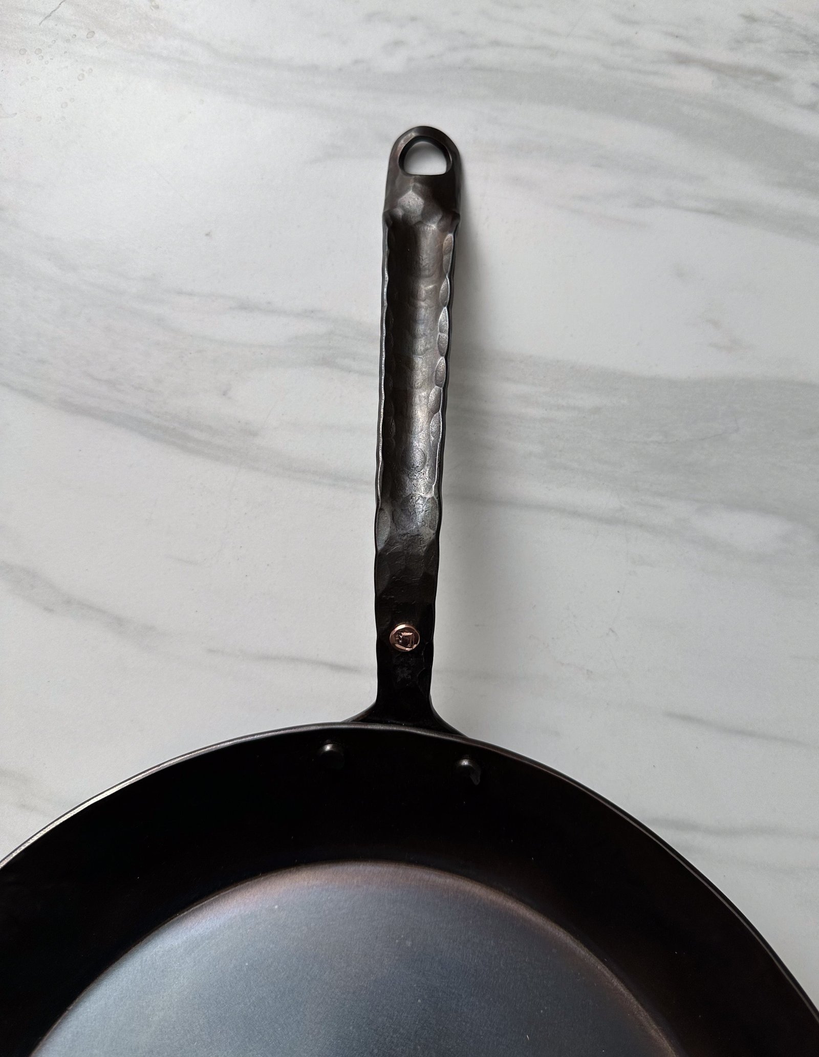Add a Flat French style carbon steel lid to your order! Our carbon steel lids are cut to match the shape of your skillet with a small overhang to account for hand forged variability. We forge a smaller version of our skillet handle that matches the style of the skillet, and attach it with two steel rivets. It is perfect for creating a convection within your skillet. ***Lids are made to order and can add up to 5-7 days to regular processing time.
