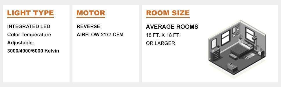 Size | Finish | Blades | Socket Type | Color Temperature | Motor | Fan Control | Fan Speed | Location |