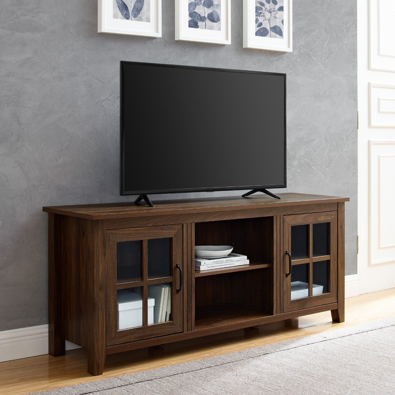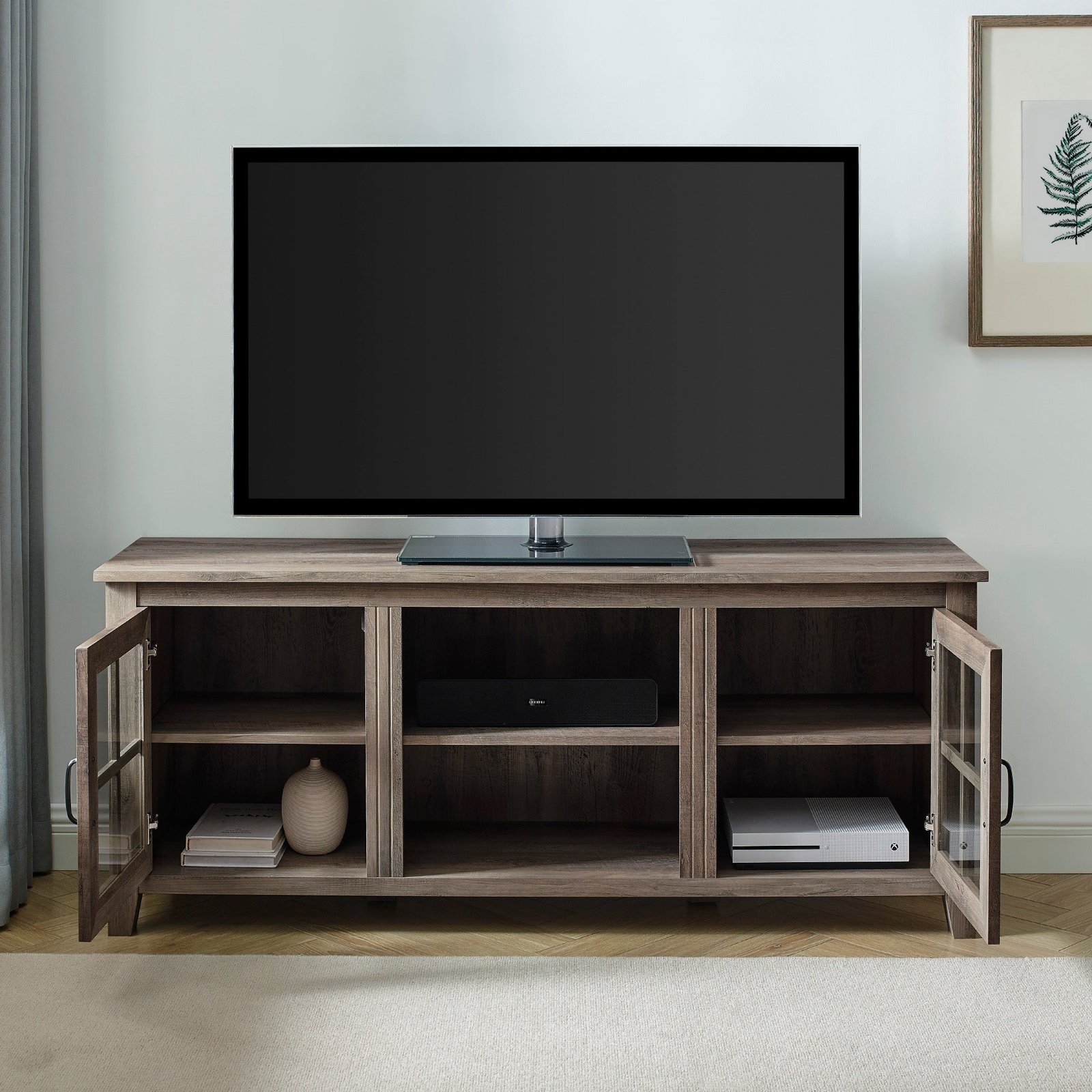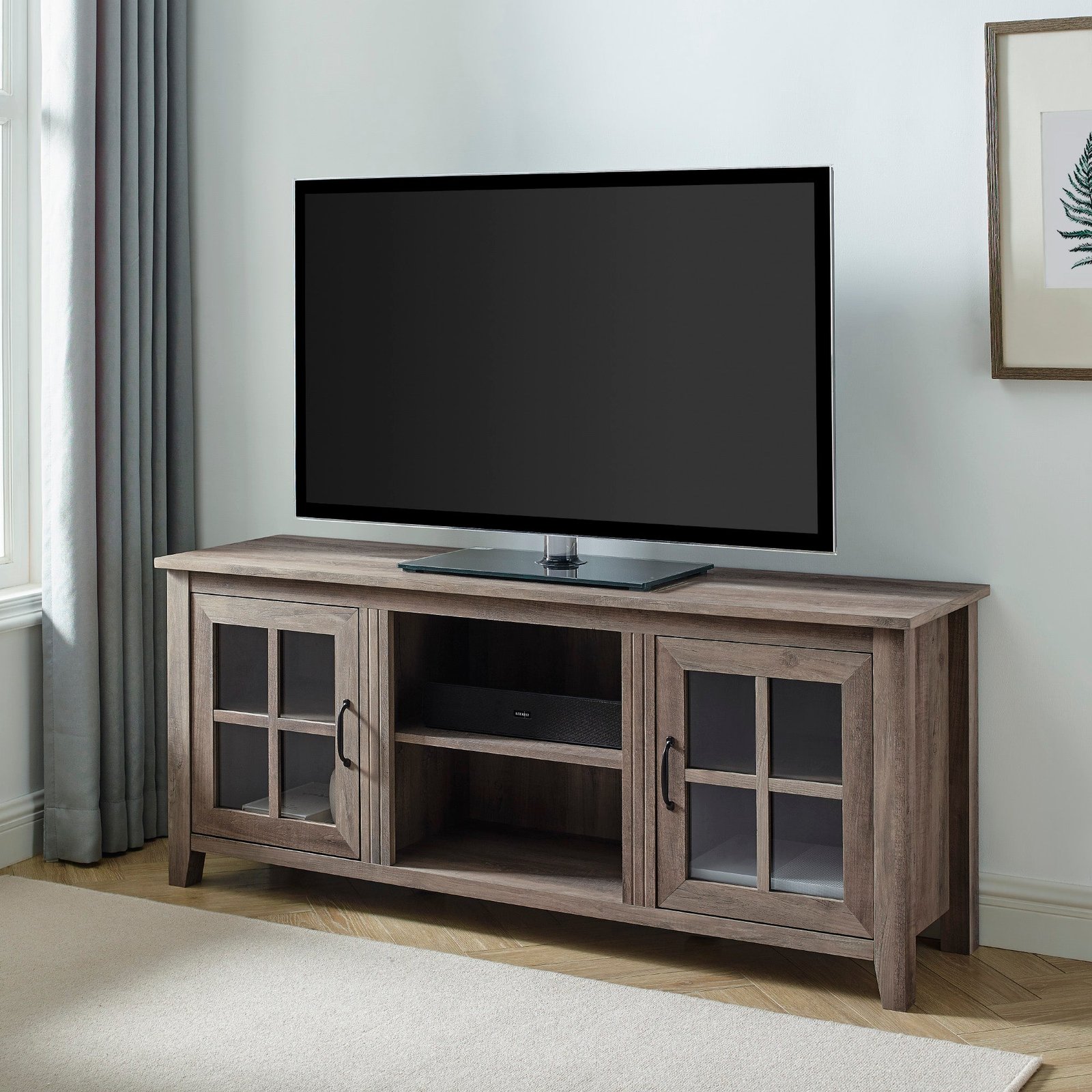 Savor slow mornings or late night series binges with this glass door TV console. Ideal for a variety of design styles, its classic silhouette offers a cool and casual air that’s sure to create a refuge to gather and watch, play, or socialize. Tempered safety glass doors with subtle, modern accents lend a stylistic approach to closed storage, and three adjustable shelves offer the perfect place to rest your media components. Created with warp-resistant MDF and long-wearing laminate, this TV stand provides endless potential to house entertainment essentials and a timeless tabletop to showcase your favorite décor.