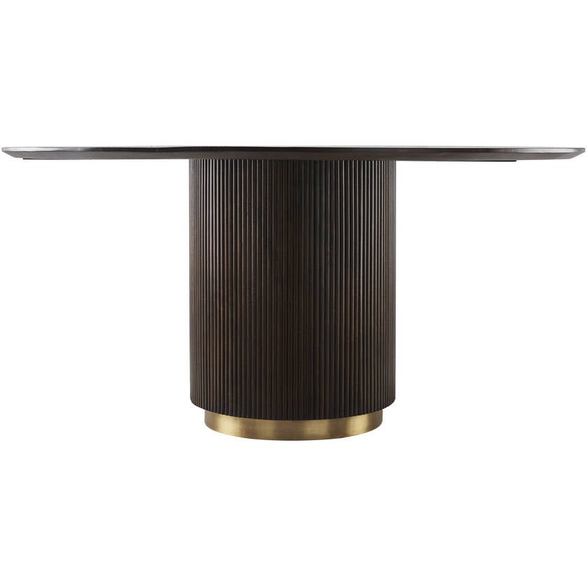 Elevate everyday meals and special gatherings alike with the refined beauty of the Allisa Dark Brown Dining Table. Handcrafted in India from high-quality mango wood, this round dining table strikes the perfect balance between contemporary design and timeless character. The rich dark brown finish pairs effortlessly with the soft gleam of brass detailing, creating a statement piece that blends function and sophistication. Designed to comfortably seat family and guests, the Allisa table invites connection and conversation into your home.