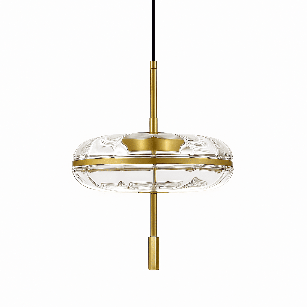 Alana pendant light features a sculptural glass light fixture with a fluid, rippled texture. Its suspended form is accentuated by a sleek metallic frame, creating a striking balance of transparency and structure. The soft glow enhances depth and ambiance, making it ideal for dining areas, kitchen islands, and modern living spaces. This pendant light blends artistry with functionality, elevating contemporary interiors with a refined aesthetic.