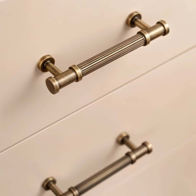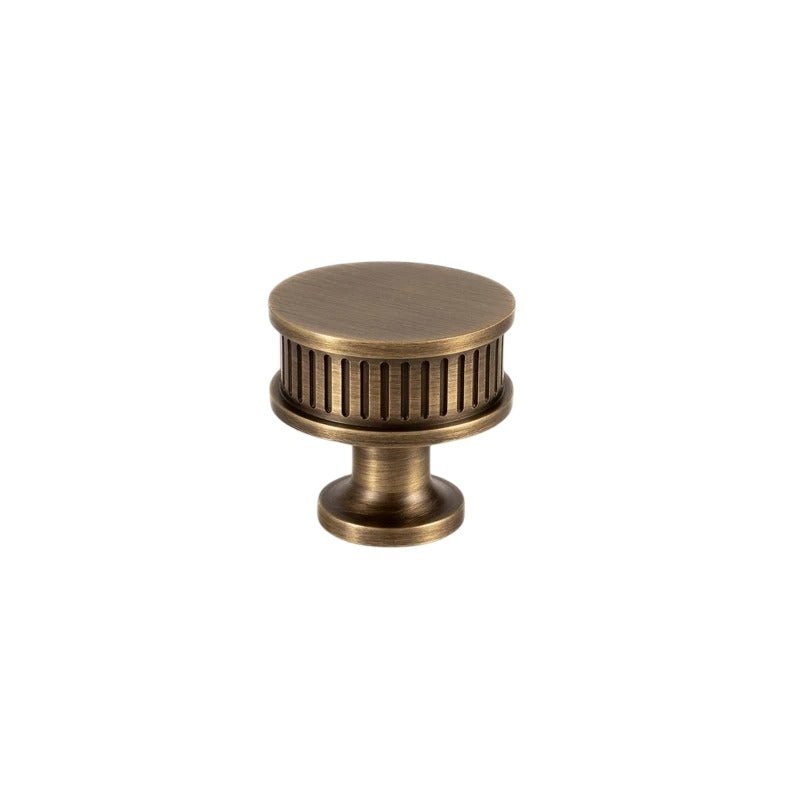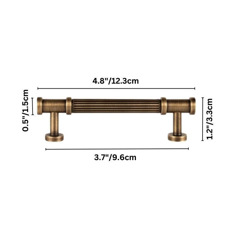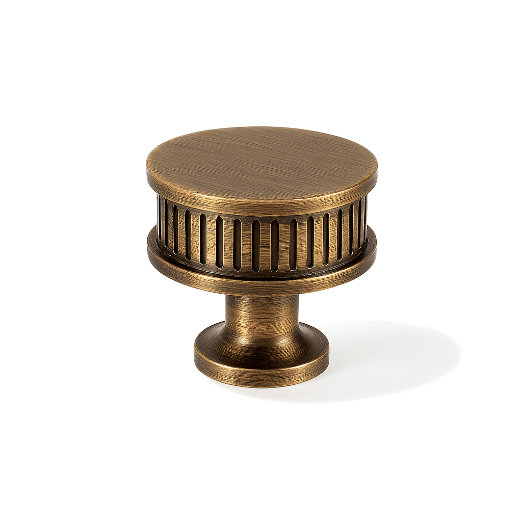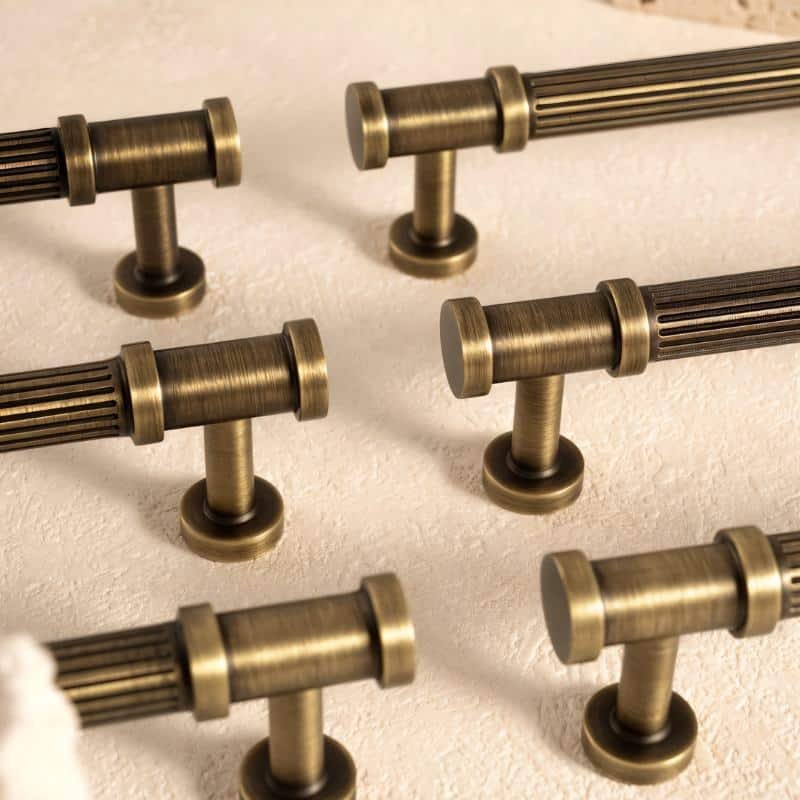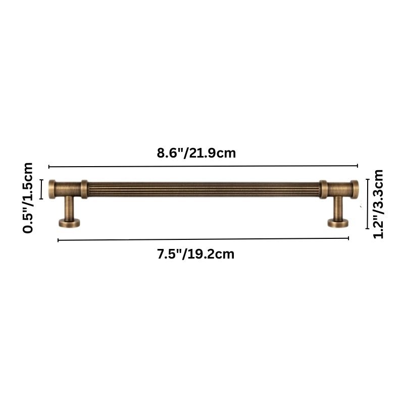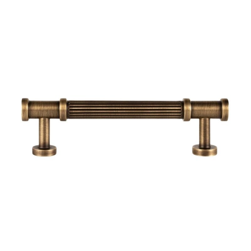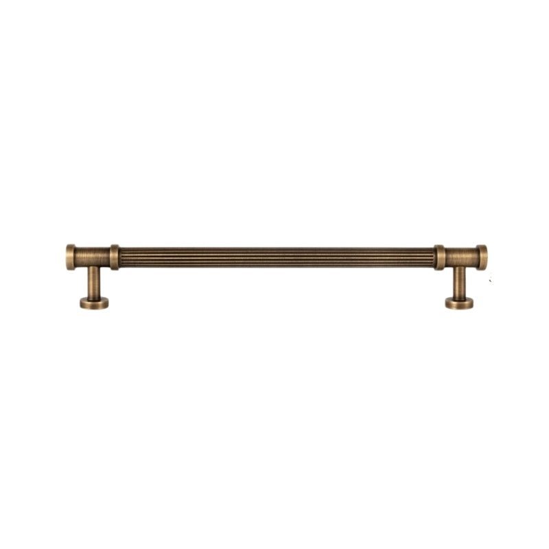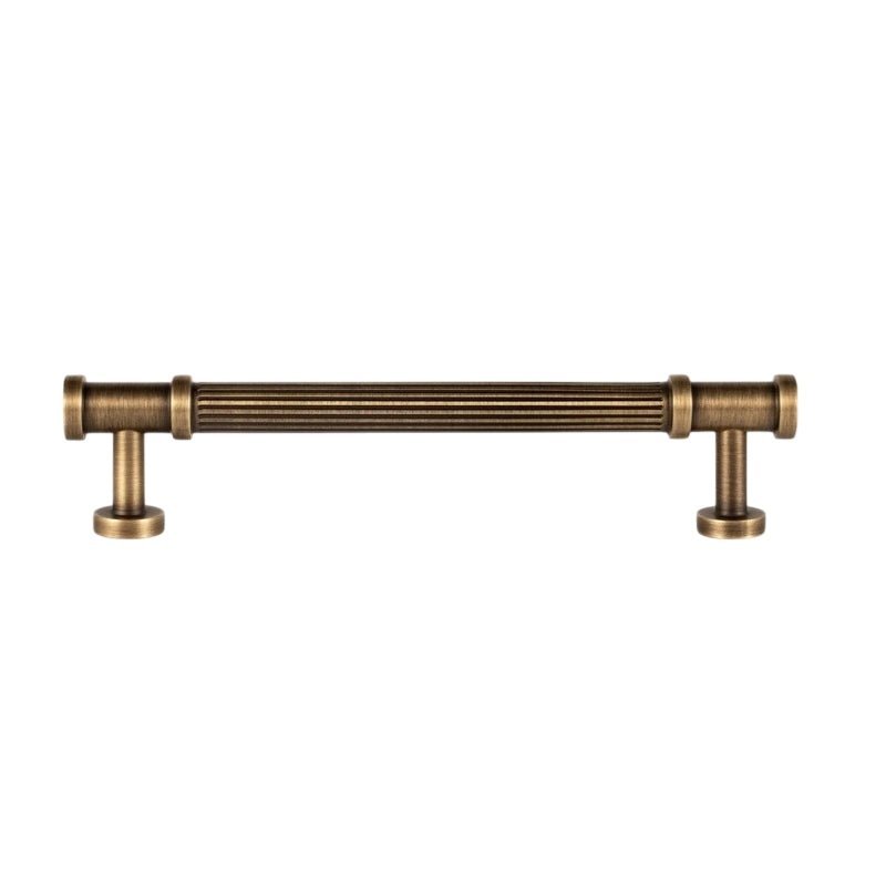 Aque is a brass pull handle featuring a fluted cylindrical design with detailed end caps. Its ribbed texture enhances grip while adding classical charm. The antique brass finish complements vintage and modern interiors alike. Ideal for cabinets, wardrobes, and drawers, it brings a refined, architectural touch to any space.