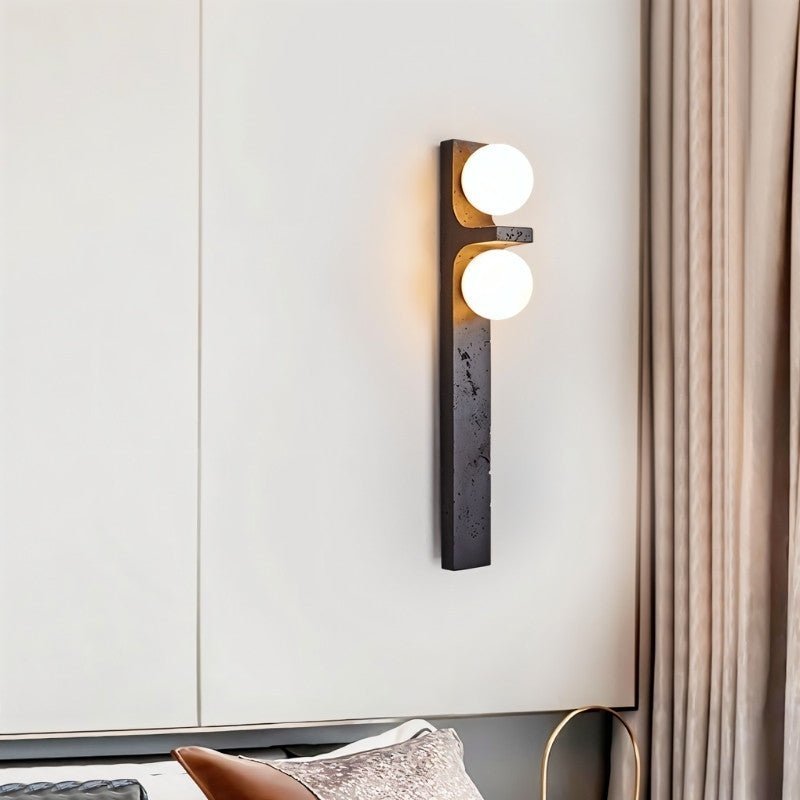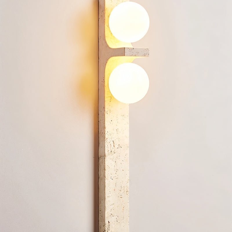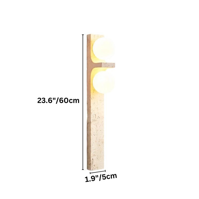 Aryil Travertine Wall Lamp is a striking fixture that blends natural travertine with smooth glass globes for a refined aesthetic. Featuring a vertical travertine base with two frosted glass globes, it offers an elegant contrast between textured stone and smooth, soft-glowing glass. The earthy tones of travertine add warmth, while the minimalist design ensures versatility across various modern and rustic interiors.