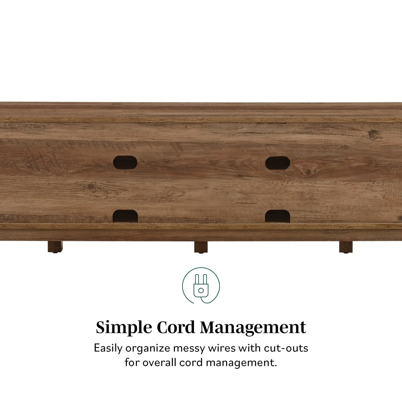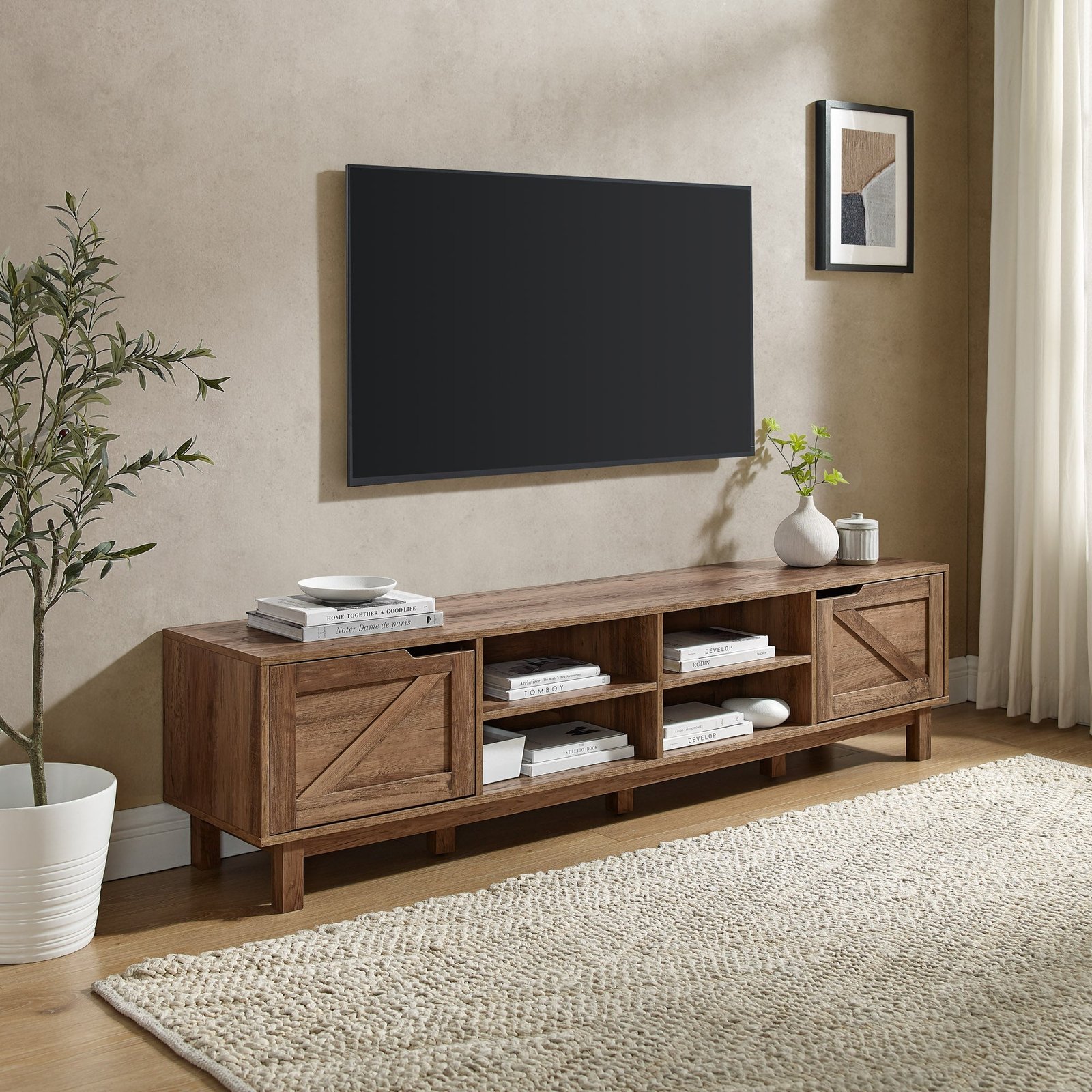 Queue rustic charm and cozy movie nights with this barndoor TV stand. While it has a low profile for a modern abode, it features more than enough storage space with four open cubbies and two barn doors that conceal additional shelves. Debut your new streaming device or old-school VHS collection atop the open shelves, and tuck away gaming essentials or spare décor behind the timeless soft-close doors. With this console’s cord management ports and ample shelving, you’ll be able to stream in organized style.