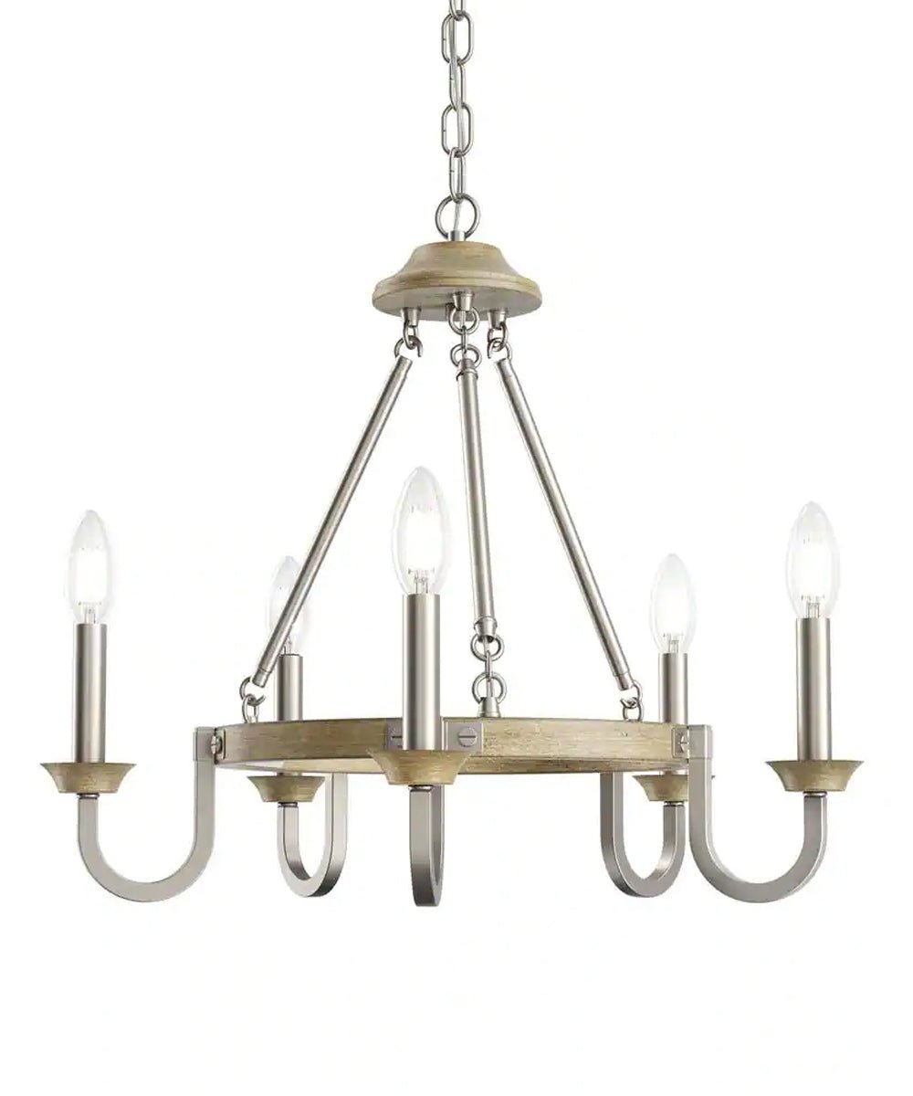 - FINISH – Mixed finish style where touches of brushed nickel highlight the arms, canopy and chains of the fixture and distressed antique gray adorns the candle base. With its 2-toned finish and rustic appeal, Barrett is the perfect fit for a modern farmhouse setting. Complete the look by adding coordinating fixtures in distressed antique gray and/or brushed nickel. Rustic lodge style chandelier perfect for a modern farmhouse look. Perfect for kitchens, dining rooms and other living spaces.