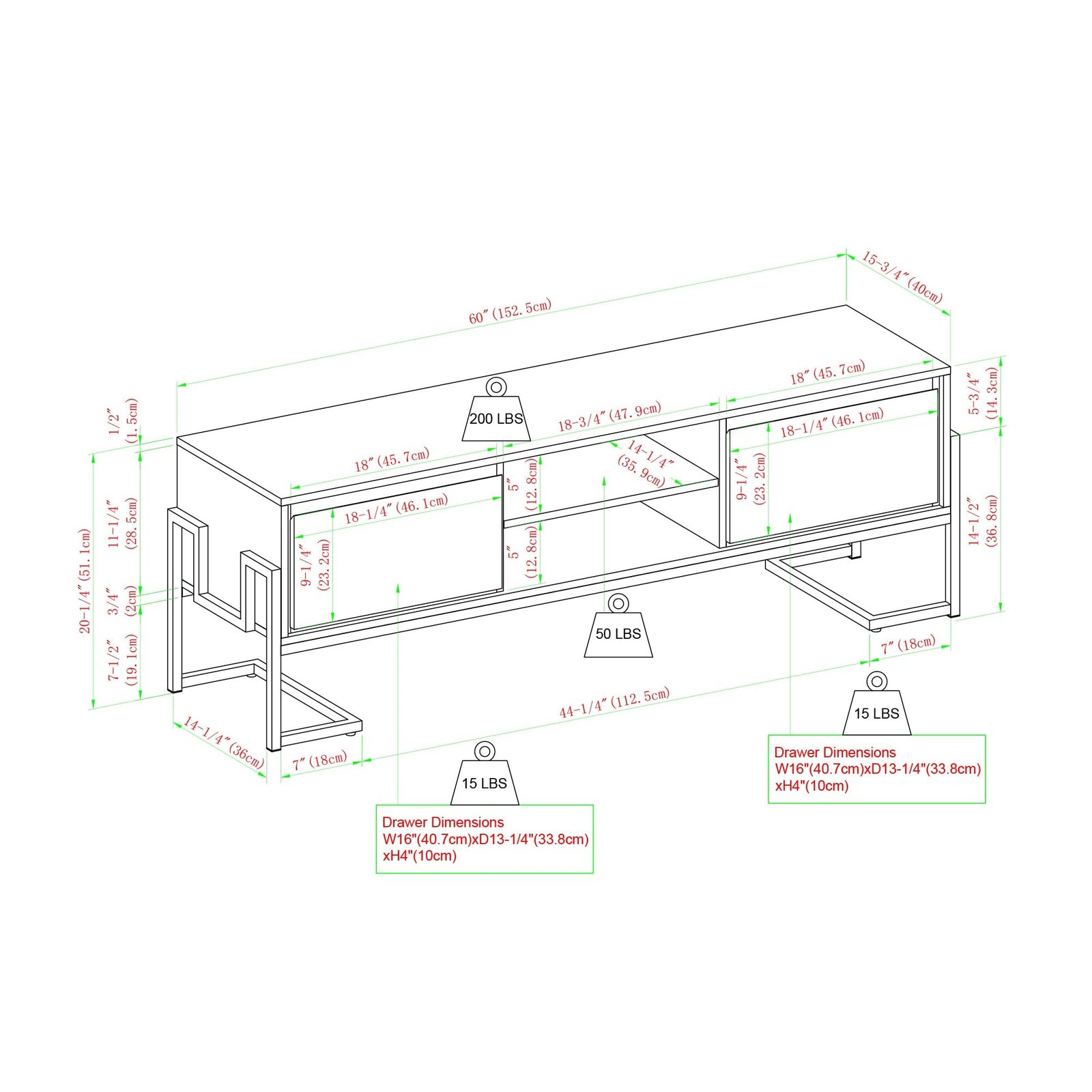 - Made with warp-resistant engineered wood, durable laminate, and powder-coated steel