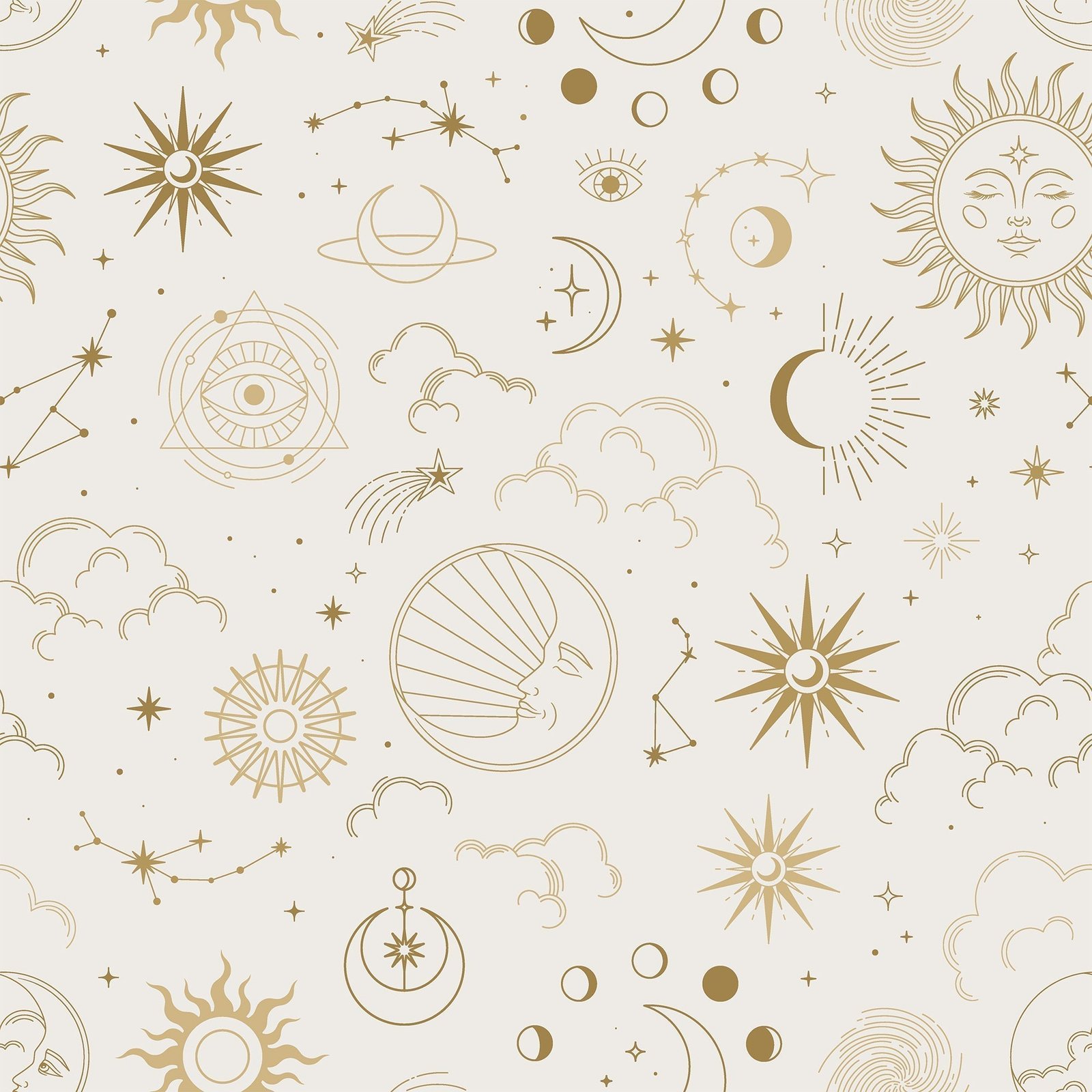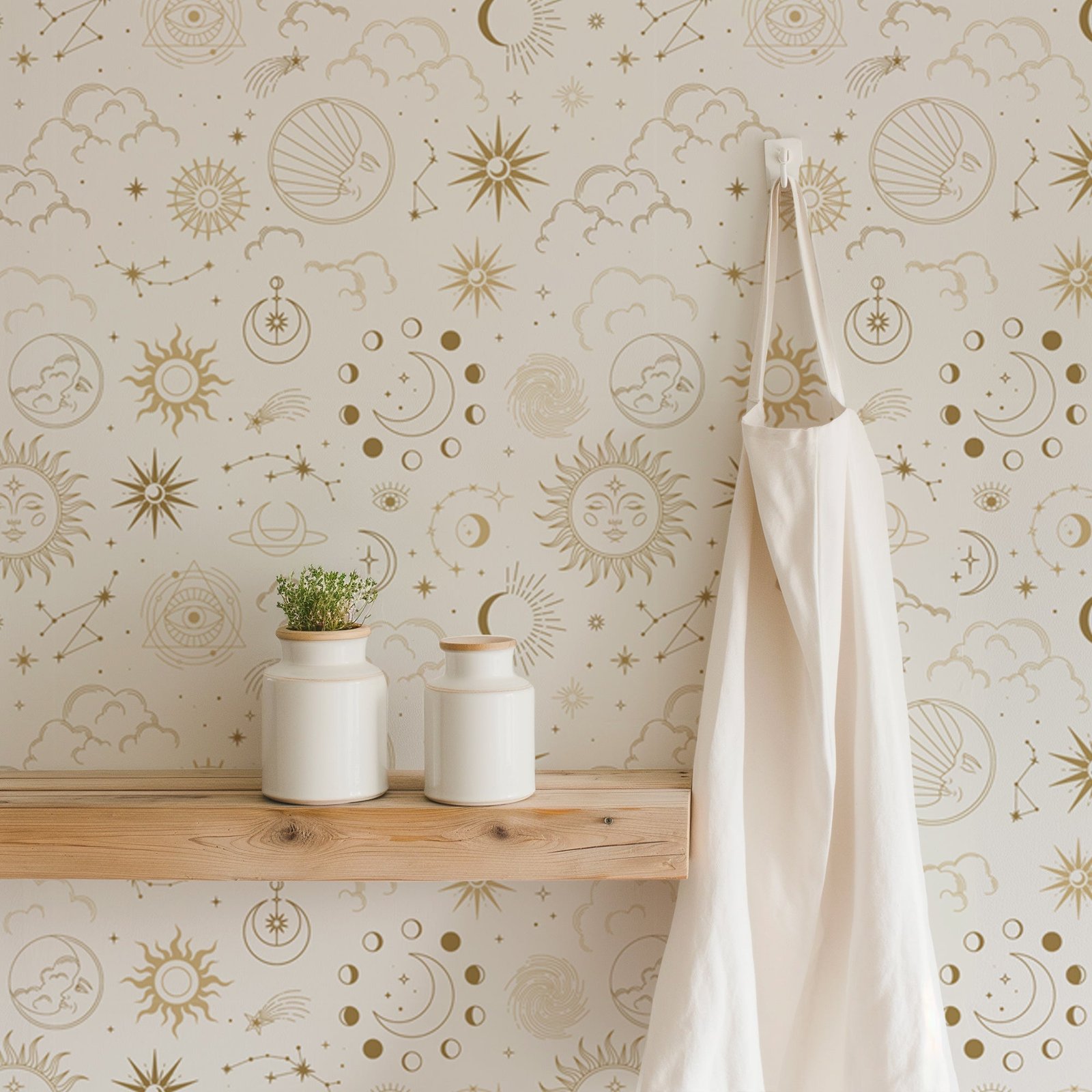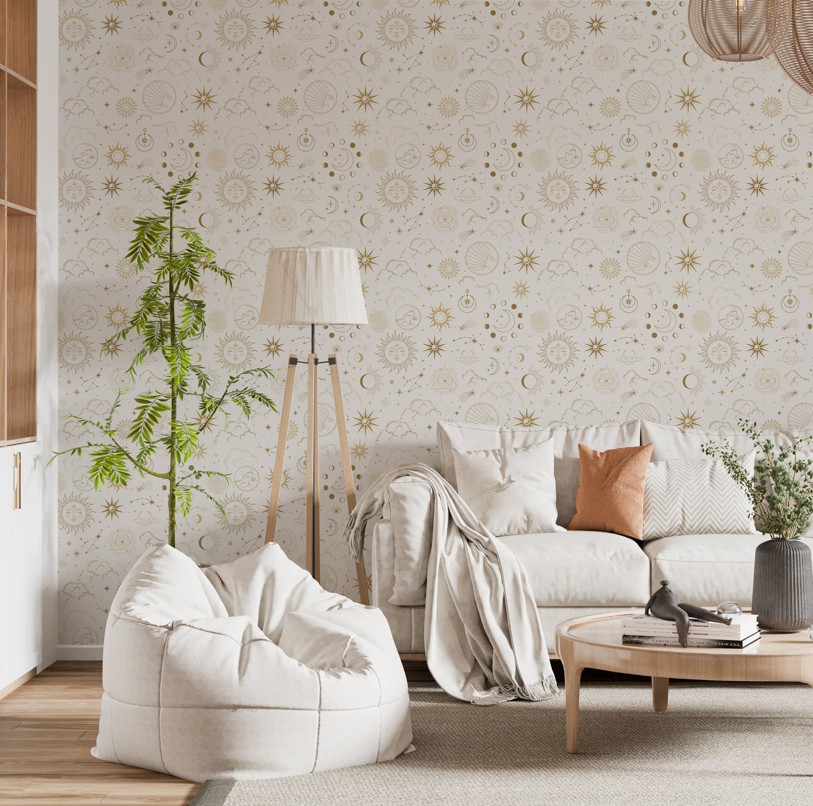 Transform your space with this celestial sun and moon wallpaper, featuring an enchanting astrology-inspired pattern with golden suns, crescent moons, constellations, and cosmic symbols. Designed for those who love boho, mystical, and spiritual interiors, this wallpaper brings a dreamy, ethereal energy to any room.