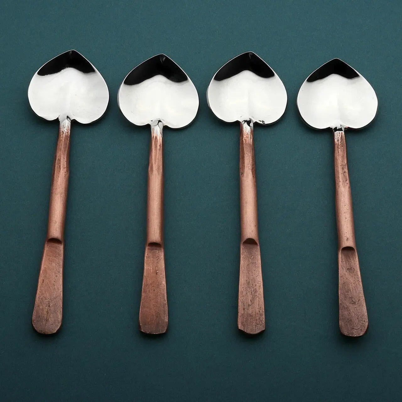 Our Celia Heart Coffee/Dessert Table Spoons bring a loving spoonful of sweetness to your morning coffee or afternoon tea. Mirror-polished heart-shaped spoons fade into faceted antique copper handles with prominent flattened cuffs, lending a striking two-tone contrast. Hand-forged from stainless steel, each set includes 4 heart-shaped table spoons. A thoughtful housewarming, wedding, or anniversary gift for your favorite couple!