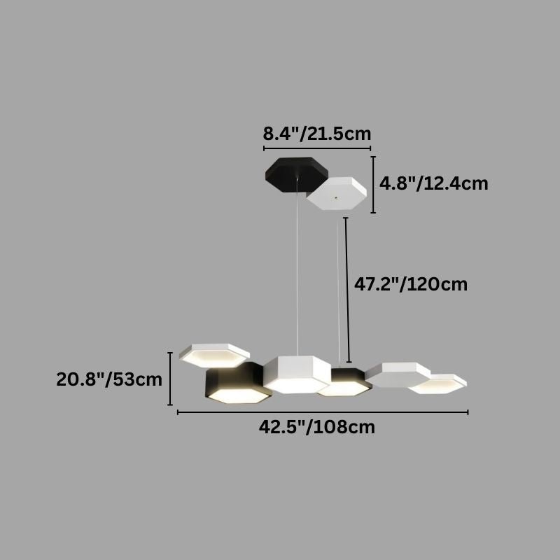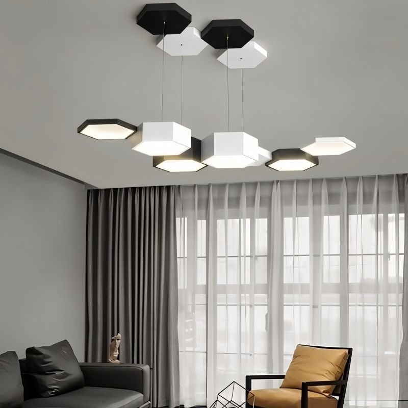 The Celvora Pendant Light features a geometric hexagonal design, combining iron and acrylic for a modern aesthetic. Its multi-head configuration (4, 5, 6, or 7 heads) allows for versatile illumination, ideal for kitchens, dining areas, or contemporary living spaces. The suspended light fixture creates a floating effect, adding depth to the interiors. A dual-tone black-and-white canopy enhances contrast and visual interest. Precision-crafted, it offers a structured yet dynamic lighting statement.