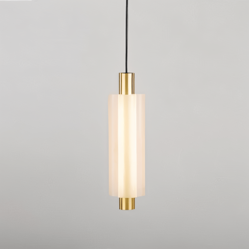 The Ceravo pendant light combines copper and frosted acrylic for a contemporary, minimalist appeal. Its cylindrical design features dual layers that emit a warm, diffused glow, creating a soft ambiance. Suspended by thin black cables, this vertical fixture adds a refined geometric element to spaces, enhancing modern interiors with a blend of elegance and simplicity. Perfect for kitchens, dining areas, and hallways, this piece is both functional and visually striking.