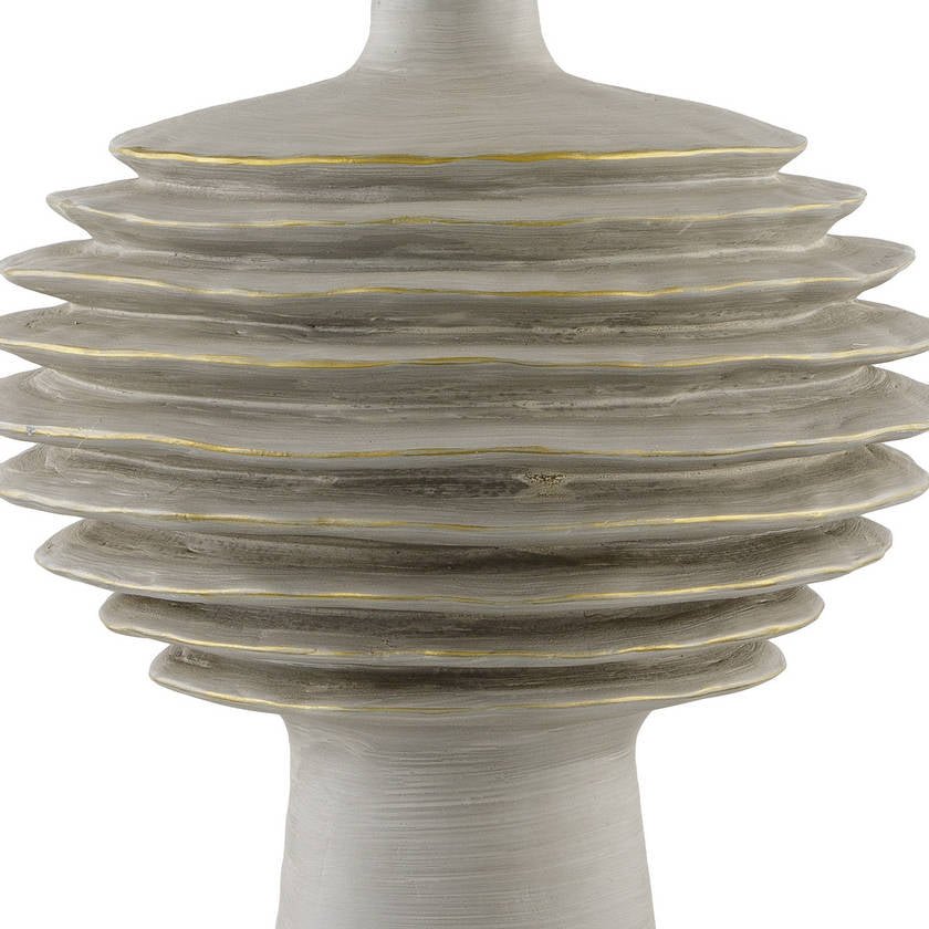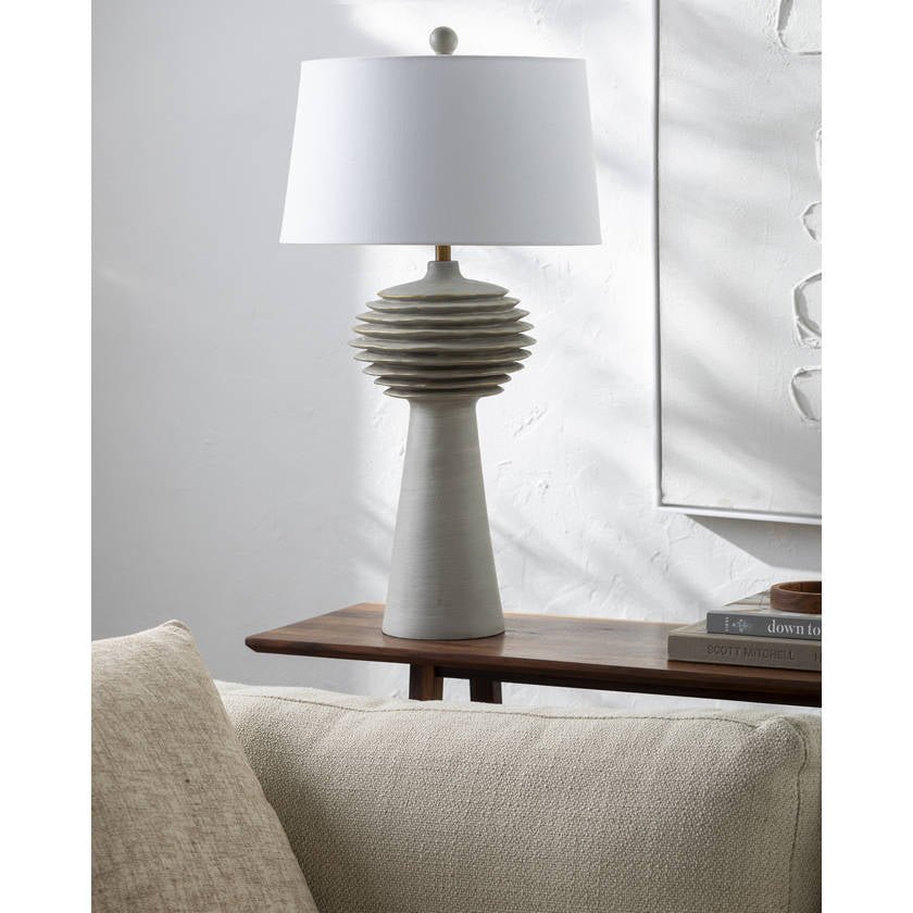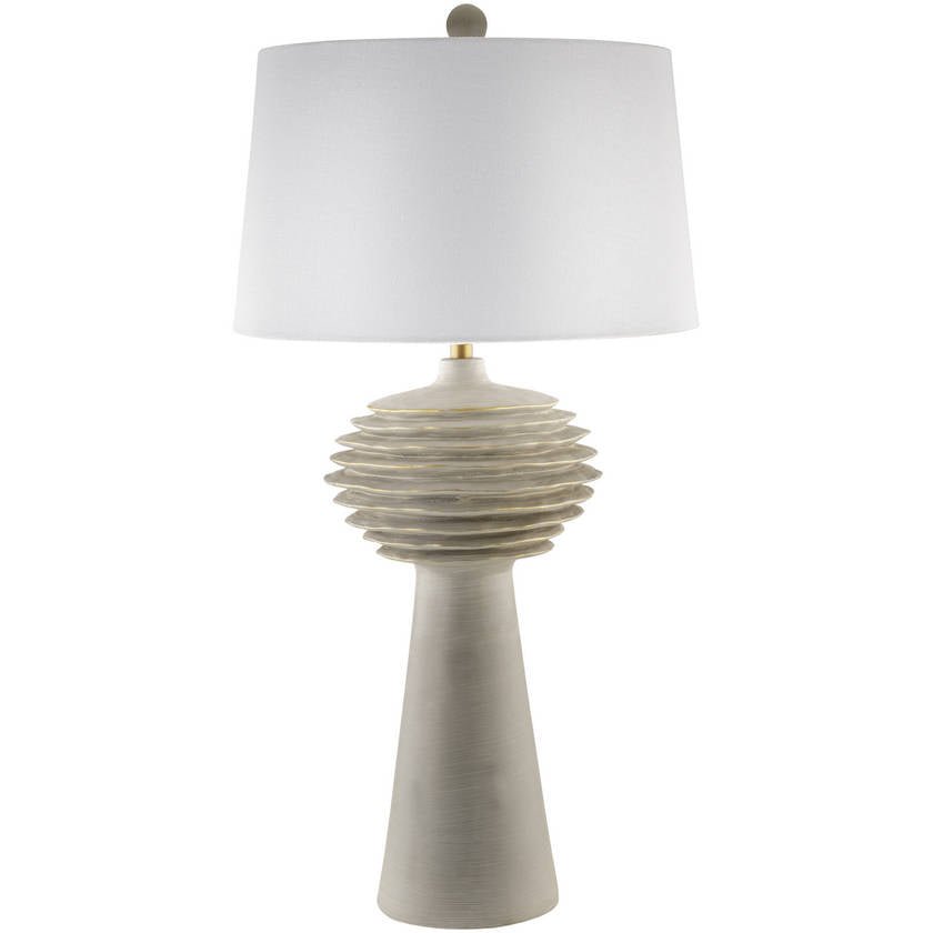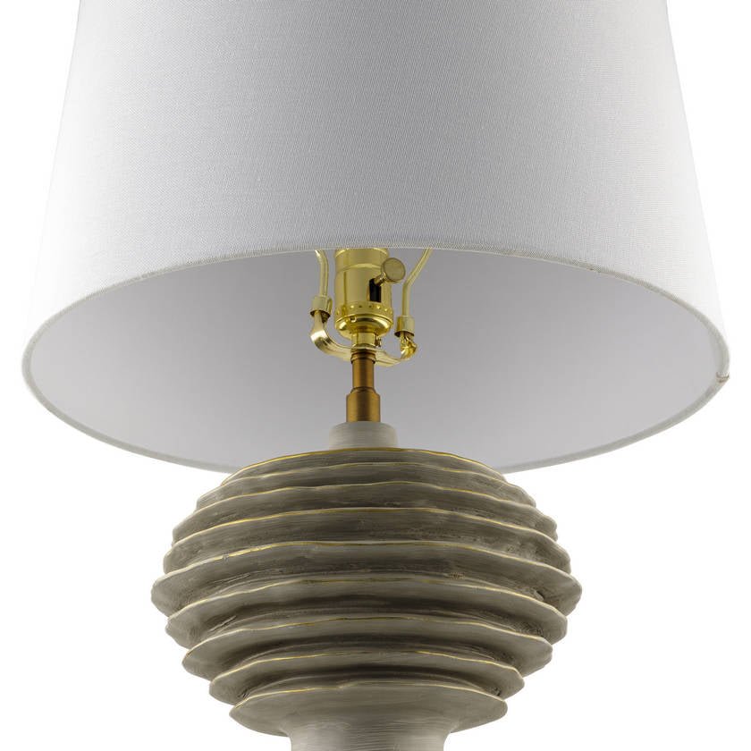 • Colors: Body: Gray; Base: Gray; Shade: White; Finial: Gray; Harp: Metallic – Brass; Cord: Translucent