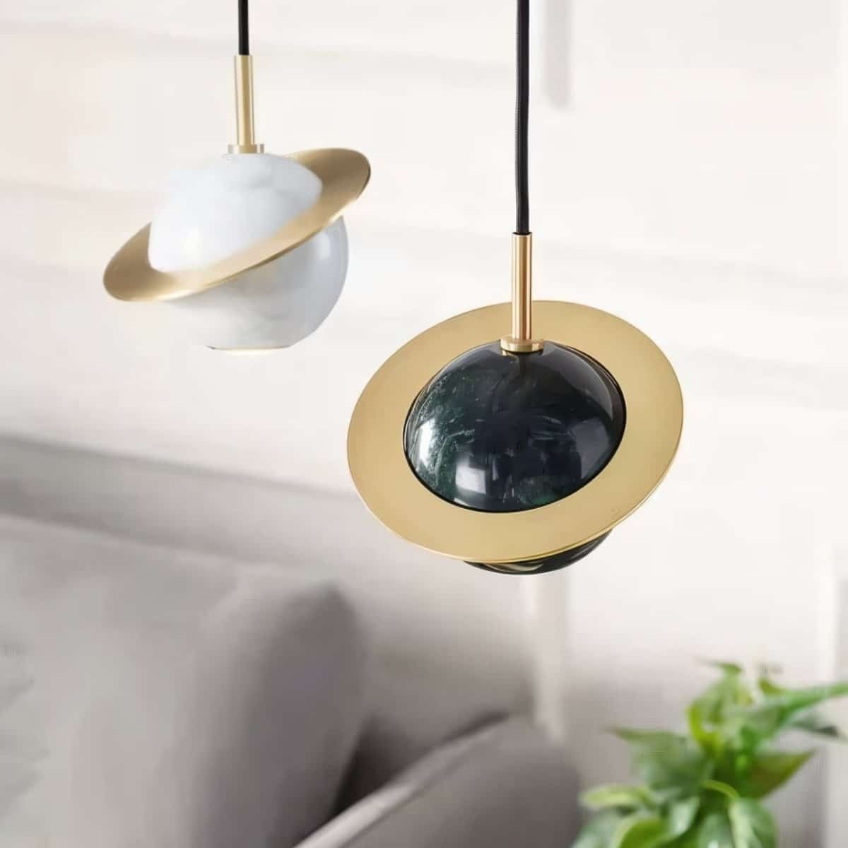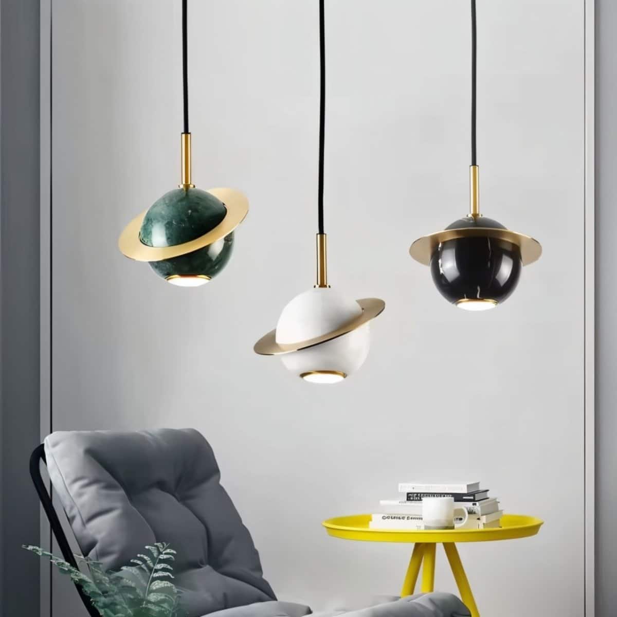 - Unique planetary-inspired design adds character to any modern space.