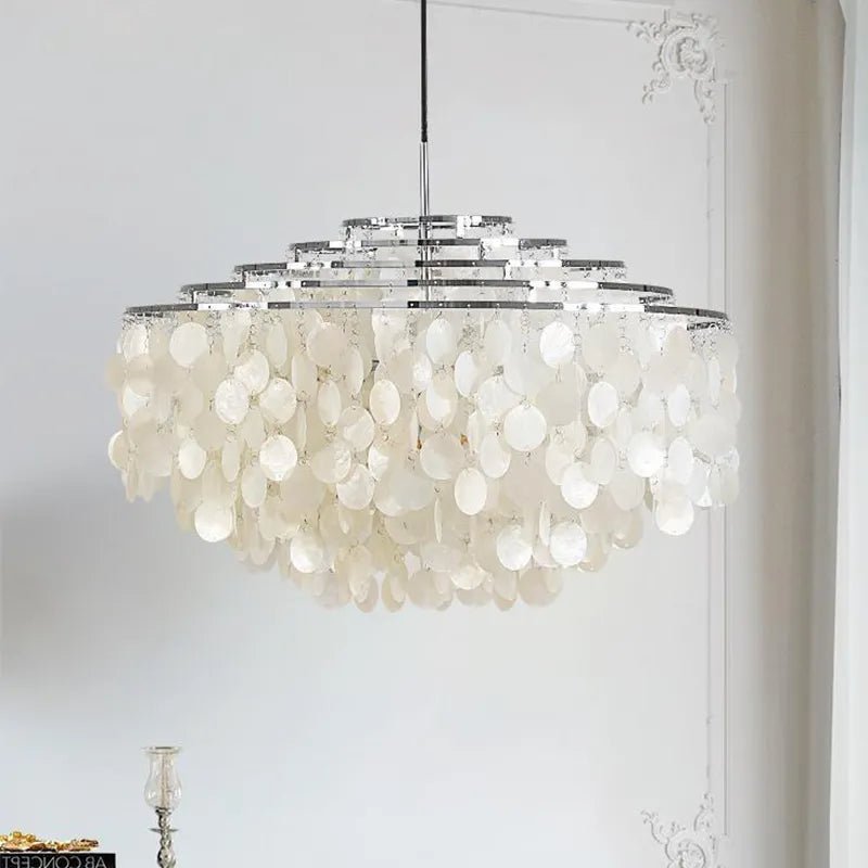 Enhance the aesthetic of your space with the exquisite charm of the Cornelia Chandelier. Featuring a metal frame and adorned with delicate Capiz shells, this chandelier imbues your surroundings with a pearlescent glow, offering a truly spectacular ambiance. Redefining bedroom lighting with a touch of glamour, casting a radiant glow throughout the entire room.