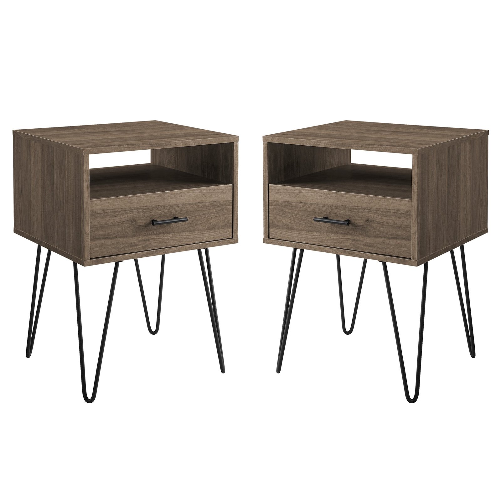 Hear the notes of old jazz echo through the house when you incorporate this set of two Mid-century modern end tables. The metal hairpin legs and box frame provide retro vibes for the living room. One drawer on easy-open metal telescoping glides offers a hidden spot to tuck clutter out of sight. Display a journal or keep track of remotes in the open cubby to personalize each piece to fit your needs. You can trust the warp-resistant MDF wood build and powder-coated steel frame to hold the items you like to keep close by.