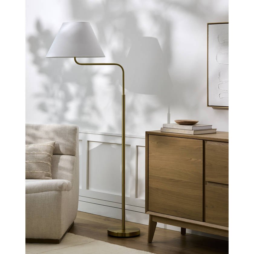 Introducing the Dangelo Accent Floor Lamp, a striking blend of Minimalist Modern style with a practical purpose. Standing tall at 61 inches, this lamp is designed with an iron body and base that exudes an industrial-chic vibe, while its cotton shade brings a soft contrast for a balanced aesthetic. The inner shade is crafted from polystyrene to ensure even light diffusion for a cozy and inviting ambiance in your space. Maintenance is as simple as it gets: just wipe clean with a dry cloth to keep this beauty shining bright. Please avoid harsh cleaners to protect the stunning finish. Illuminate your home in style with the Dangelo Accent Floor Lamp; it’s not just lighting, it’s art that lights up!