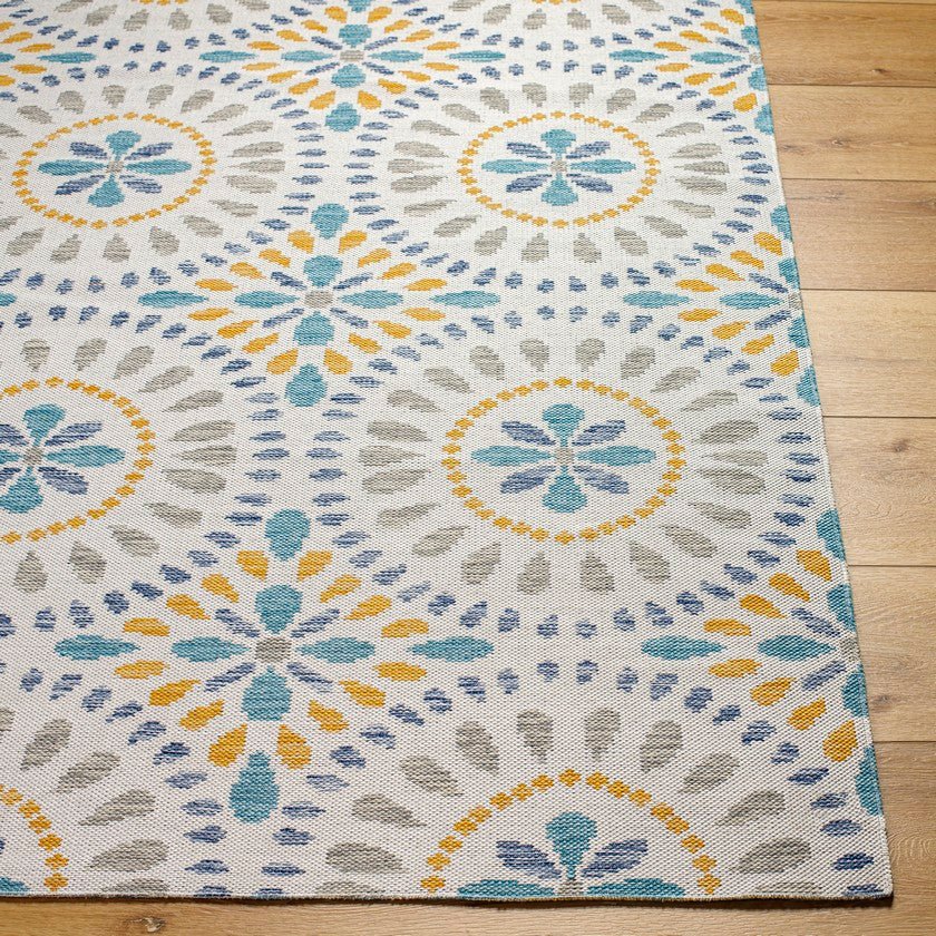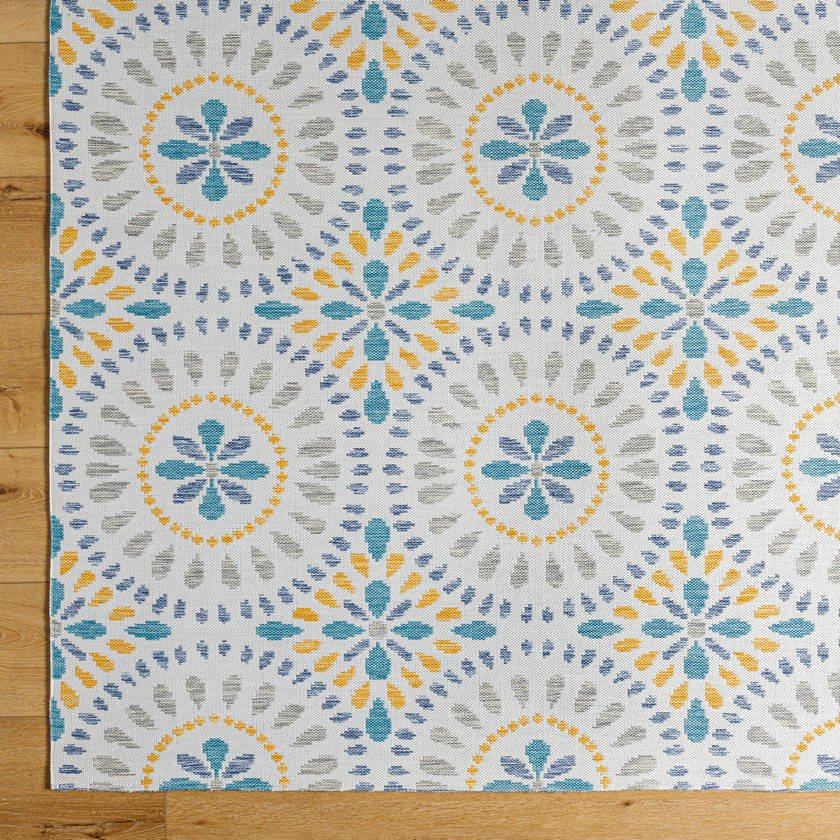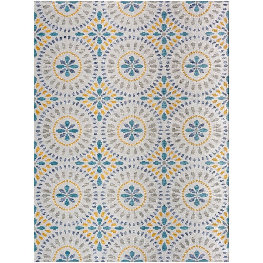 Enhance your home with the versatile beauty of the Devorah Coastal Light Gray Dark Teal Area Rug. Expertly machine-woven in Turkey from durable polypropylene, this rug showcases a captivating bohemian-inspired medallion pattern in a refreshing palette of off-white, dark blue, light gray, teal, and mustard. Its robust construction and no-pile design make it an ideal choice for high-traffic areas, and its outdoor-safe feature extends its versatility to your patios and decks. Cleaning is a breeze, simply hose it down! For added comfort and to prevent slipping, we recommend using a rug pad underneath. Bring warmth, style, and practicality to your space with this beautiful piece.