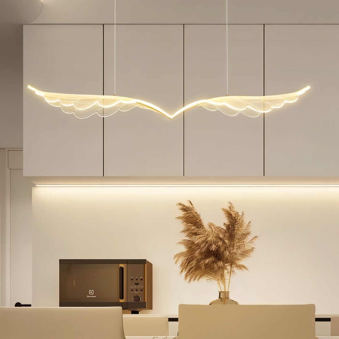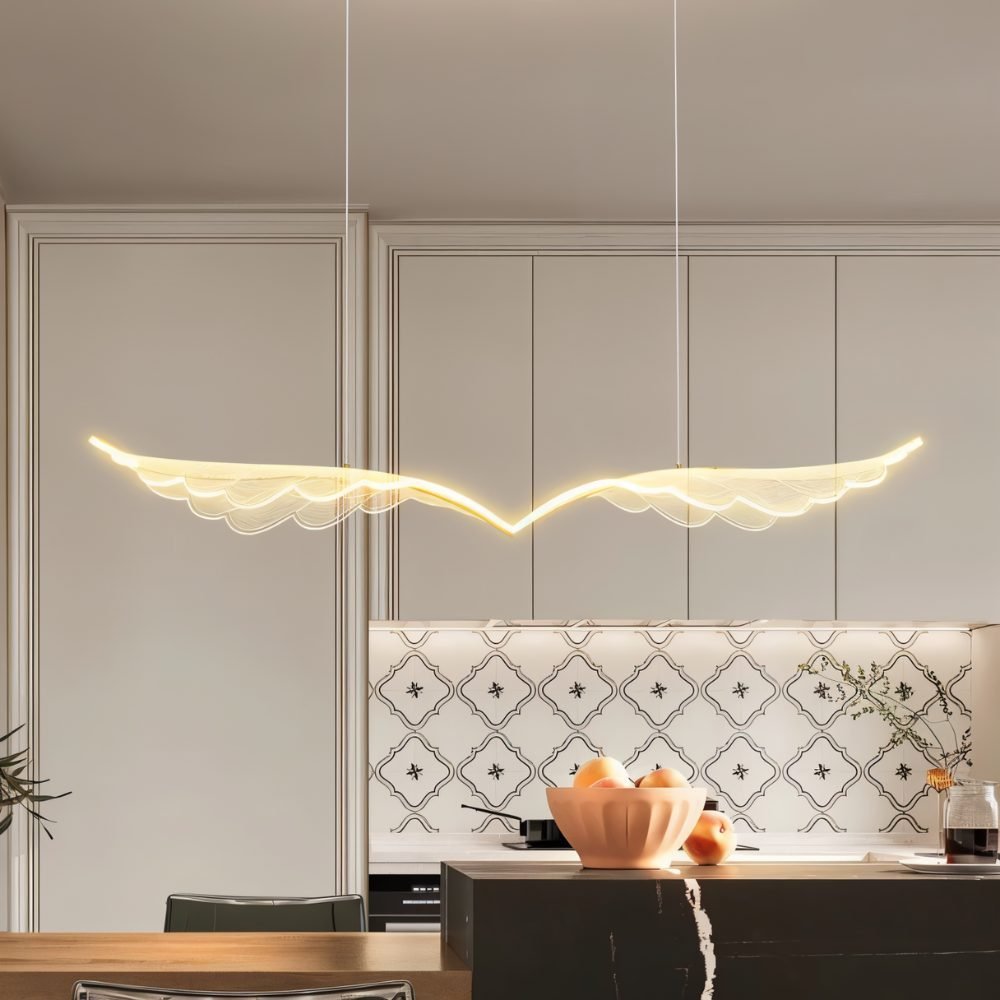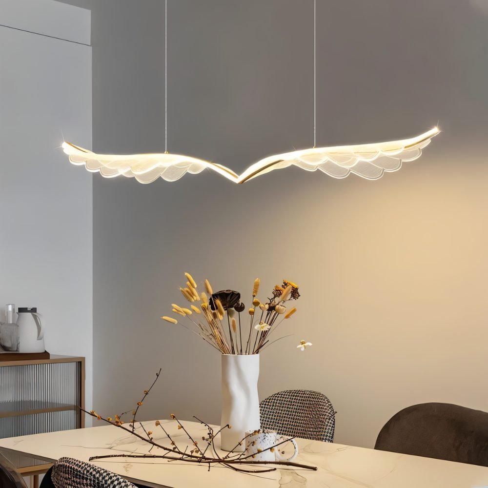 The Djilyna Pendant Light combines artistry and innovation, crafted from clear acrylic and an aluminum frame. Its wing-inspired design features integrated LEDs that create a mesmerizing glow, transforming any space. Perfect for illuminating dining areas, it adds sophistication and sparkle to your table. Djilyna is a striking lighting fixture that enhances ambiance and style.