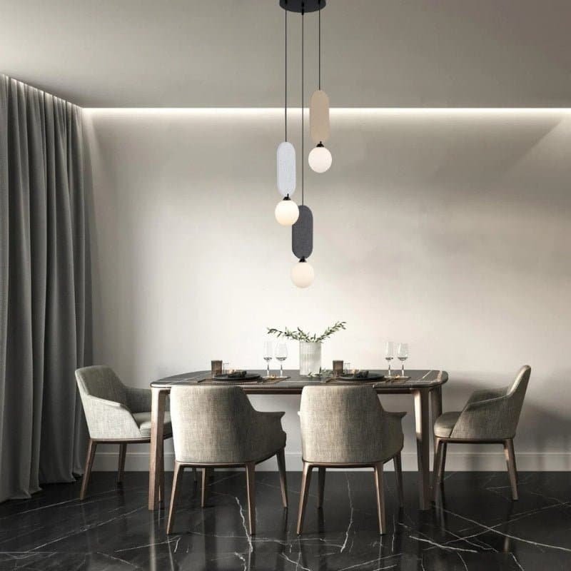 The Dorea Pendant Lamp is a modern light fixture combining a spherical glass bulb with a sleek metal frame and a vertical fabric panel in various colors. Its balanced design creates visual and textural contrast, making it a striking addition to any space. Ideal for dining rooms, living areas, or offices, this pendant lamp enhances ambient lighting while complementing contemporary and transitional interiors with its minimalist aesthetic.