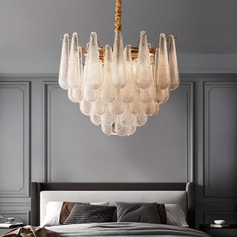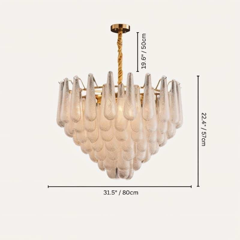 The Duska Chandelier boasts a mid-century aesthetic that will make a grand impression on your home. Its stylish circular metal frame and gorgeous gold trim details complement your decor well. The chandelier is adorned with a multitude of magnificent patterned glass petals that hang down in tiers and shimmer in the light, giving it a harmonious and sumptuous appearance. Duska has a mesmerizing teardrop-like effect that will look stunning installed above a dining table, or in the center of a living room or bedroom.