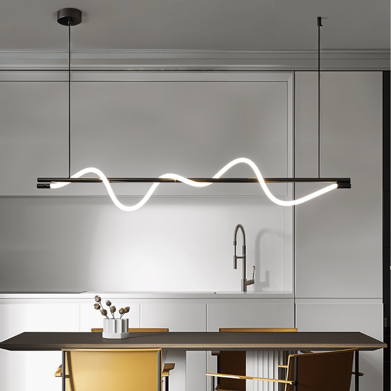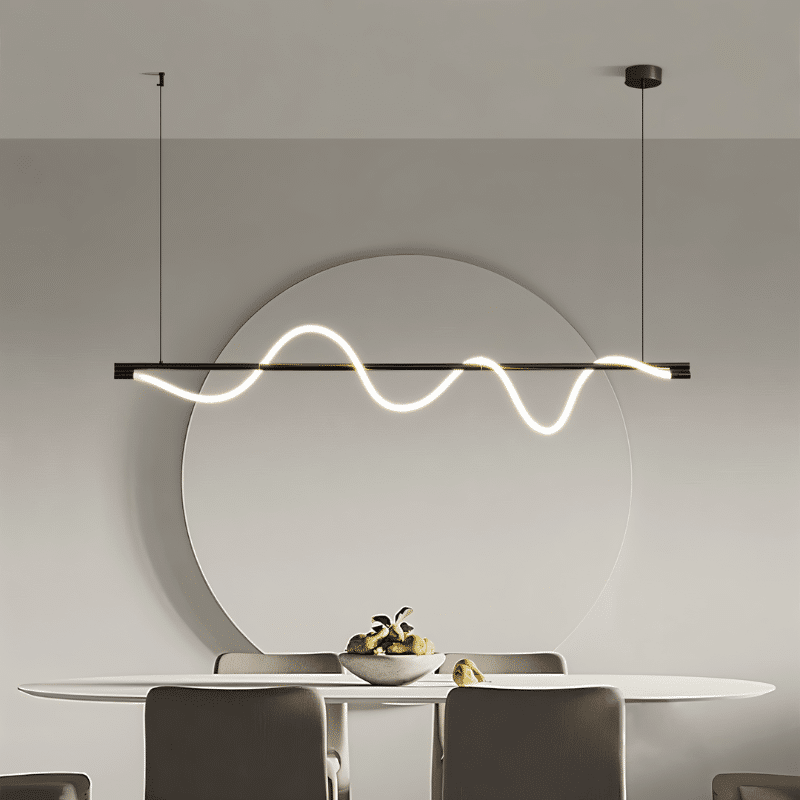 The Eluna Pendant Light is a striking contemporary light fixture crafted from copper and silicone, featuring a sculptural, flowing wave design that brings dynamic energy to any space. Its minimalist linear form is elegantly suspended, making it perfect for dining areas, kitchen islands, or modern office settings. The soft, continuous LED glow accentuates the fixture’s artistic curves, creating both functional illumination and a sophisticated visual statement. This light fixture seamlessly merges artistic expression with modern practicality.
