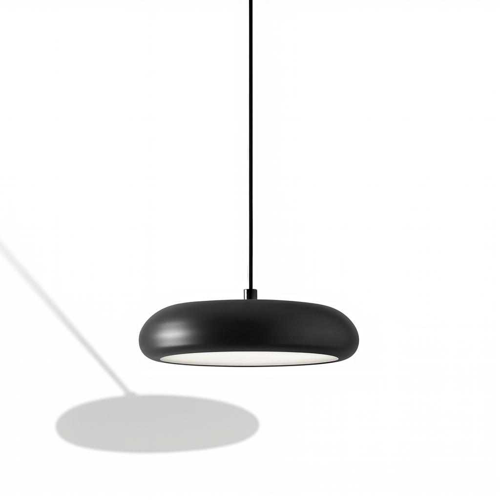 The Emiva Pendant Light features a minimalist dome silhouette crafted from iron with a smooth matte black finish and an integrated acrylic lampshade, offering soft, diffused illumination. This modern light fixture showcases a clean, sculptural form ideal for contemporary interiors. Its sleek suspension and balanced proportions suit dining areas, kitchen islands, or entryways. Designed for both function and style, it enhances ambient lighting with subtle elegance. This ceiling-mounted light fixture delivers a refined, architectural presence in any room.