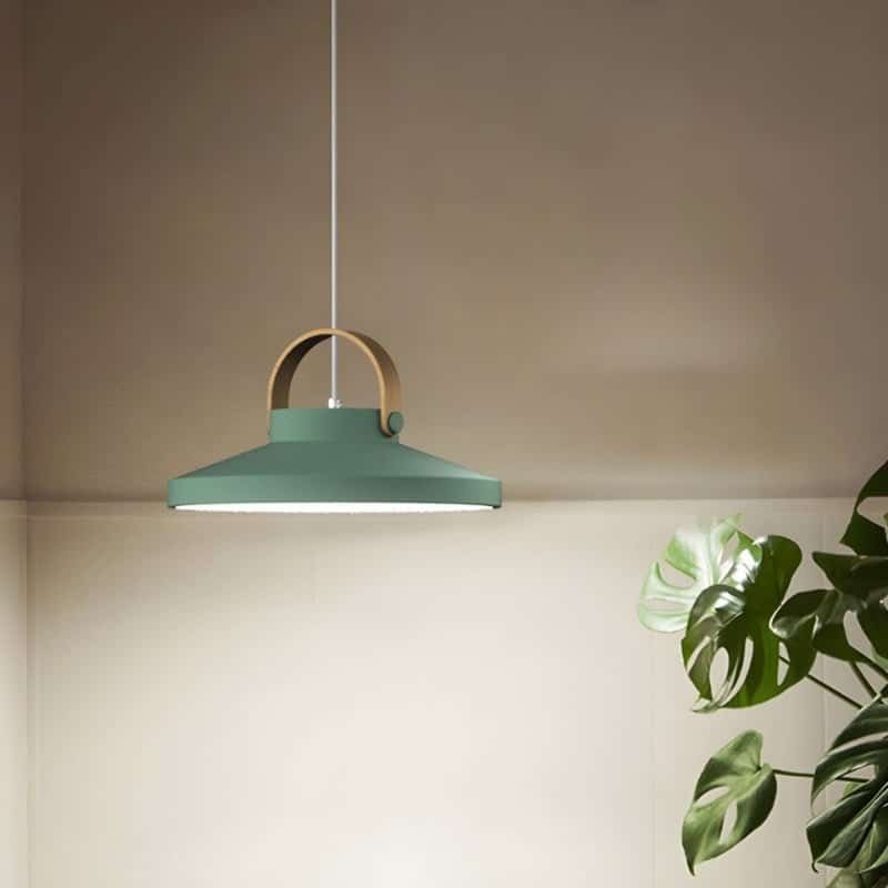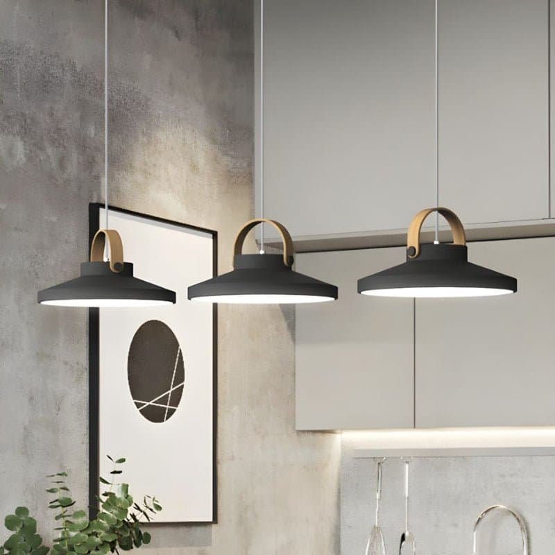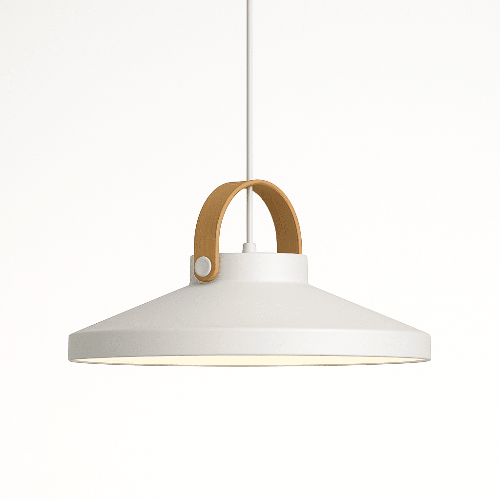The Enara Pendant Light is a sleek, modern light fixture made from metal and iron, featuring a minimalist bell-shaped shade and a stylish wooden handle. It offers soft, diffused LED lighting, creating a warm, inviting atmosphere. Ideal for kitchen islands, dining areas, or living rooms, this light fixture combines industrial design with natural accents, enhancing contemporary spaces with both function and style. Perfect for modern or Scandinavian-inspired interiors.