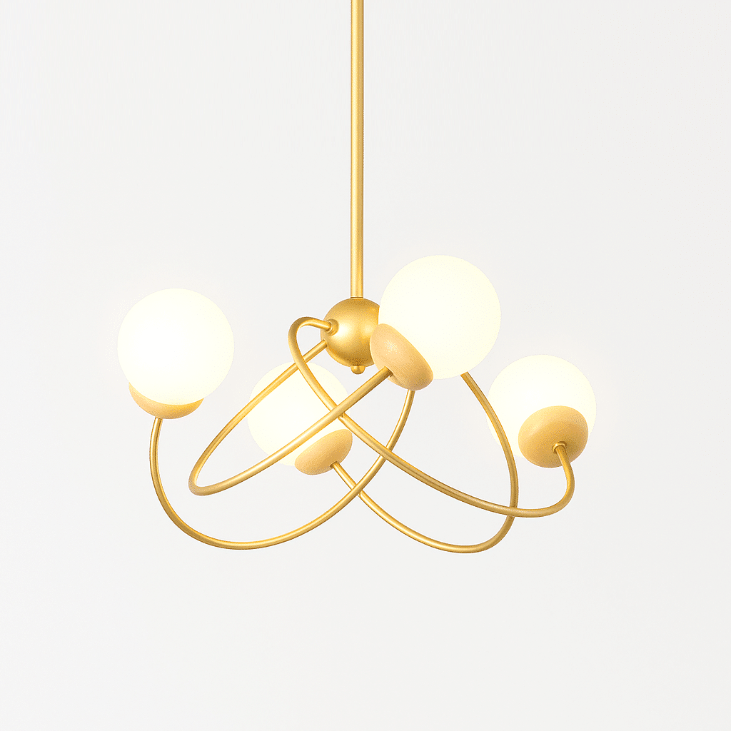 The Enfys Chandelier is a sculptural ceiling light fixture featuring fluid, orbit-inspired metal arms with frosted glass globes. Crafted from iron, wood, and glass, its dynamic structure adds a striking focal point to modern interiors. Ideal for dining areas, living rooms, and upscale commercial spaces, it delivers ambient illumination while elevating contemporary aesthetics.