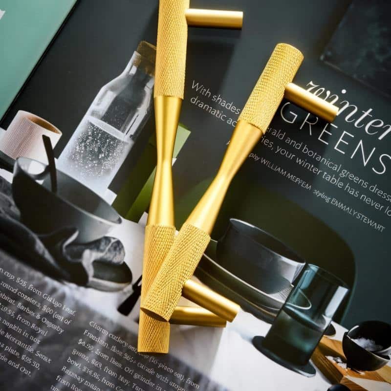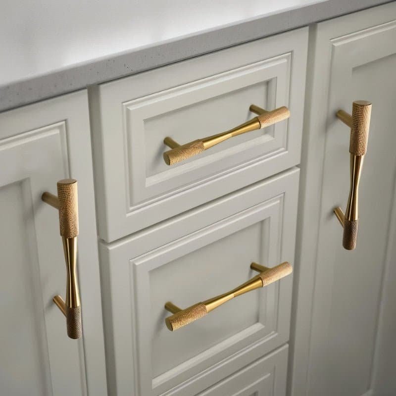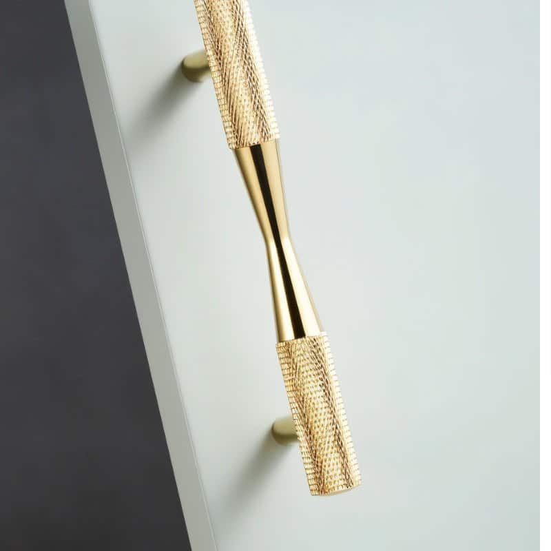 The Esnato pull bar is crafted from premium brass, featuring a sleek cylindrical design with knurled detailing that enhances grip and adds a textured aesthetic. The tapered ends seamlessly balance modern elegance with ergonomic functionality, making it ideal for various interior applications. This handle is perfect for kitchen cabinets, wardrobe doors, and drawers, providing durability and a sophisticated look.