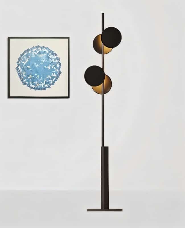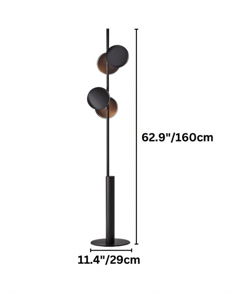 The Evolis Floor Lamp is a modern light fixture crafted from iron, featuring a sleek vertical frame with offset circular shades that diffuse warm, ambient light. The asymmetrical design creates a sculptural effect, making it an artistic addition to living rooms, lounges, or bedrooms. The black and gold contrast enhances its contemporary appeal, complementing minimalist and modern interiors. Its sturdy base ensures stability, while the slim profile allows placement in compact spaces. Ideal as an accent or statement piece, it provides both functional illumination and visual depth.