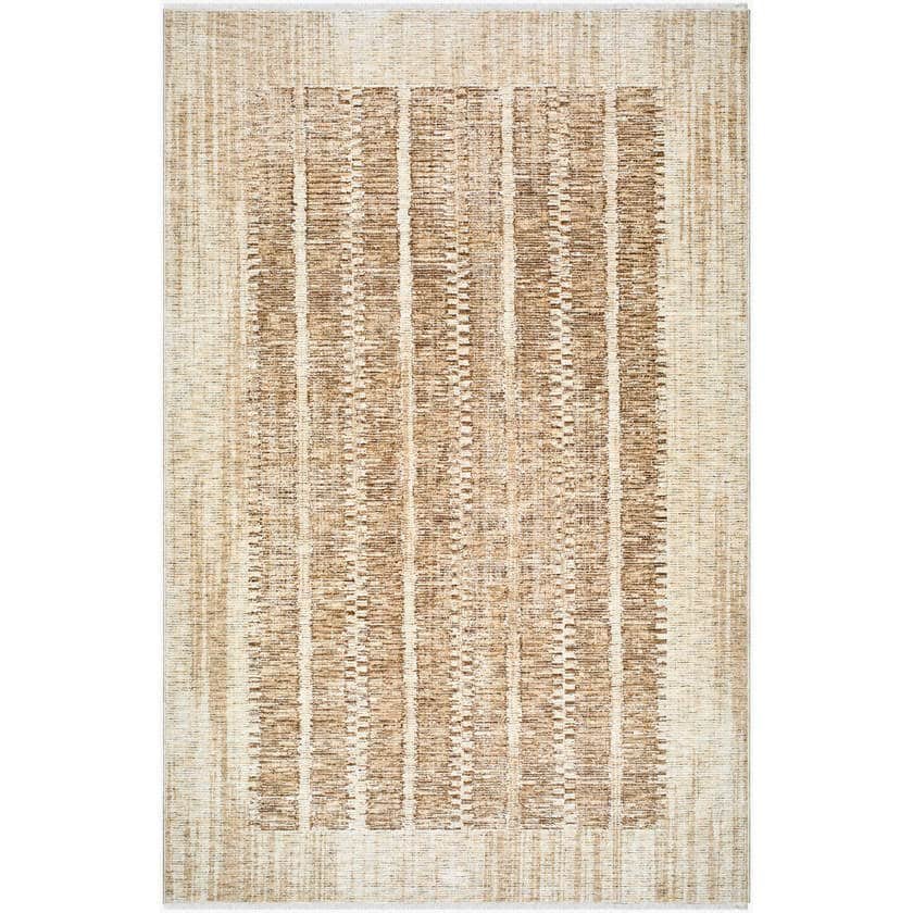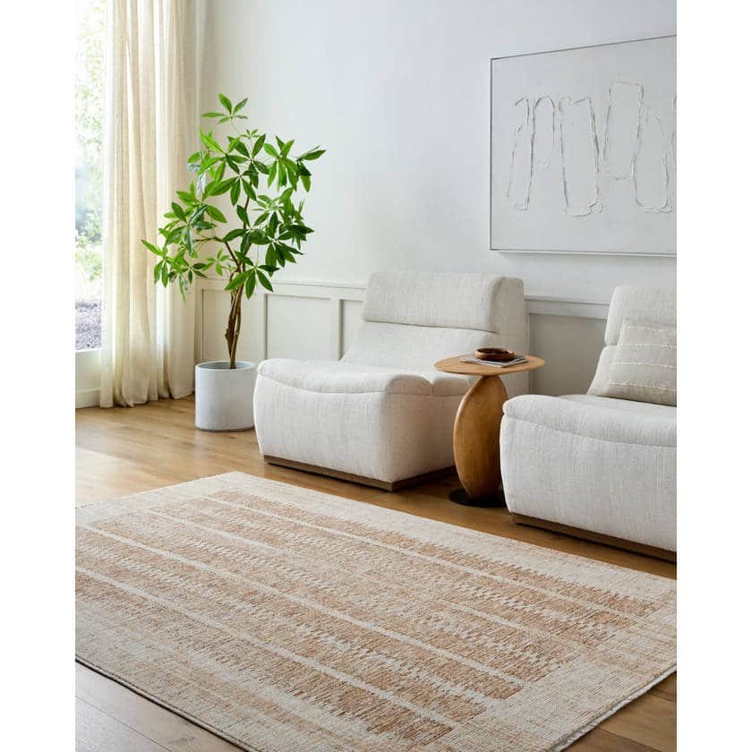 This contemporary modern area rug from the Evyan Collection is a special collaboration between the Frank Lloyd Wright Foundation and Surya. Designed with an inviting blend of warm white, tan, and brown hues, this piece exudes a sophisticated charm that will elevate any room in your home. Made of polyester and manufactured in Turkey, it features medium pile that holds up well in high-traffic areas. The rug boasts a unique fringe detail for an added touch of elegance. To maintain its pristine condition, we recommend using it with a rug pad and spot cleaning with mild detergent when necessary. This stylish piece isn’t just a rug – it’s art for your floors!