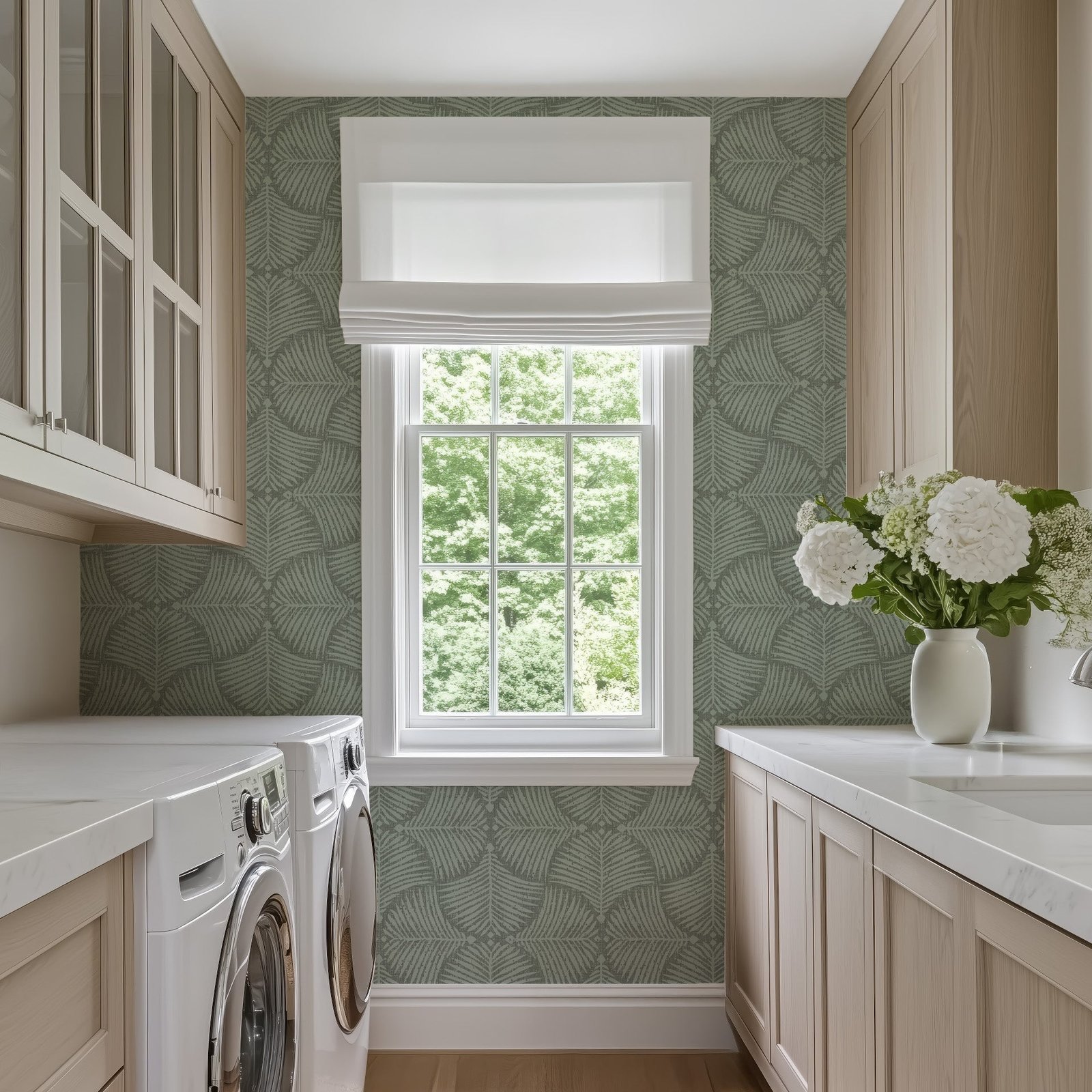 This design draws its strength from contrast – where structured, hand-drawn palm leaf motifs meet a textured, linen-like backdrop in muted sage and olive tones. The result is a modern tropical wallpaper that feels organic, serene, and surprisingly versatile. It’s bold in texture but soft in spirit.