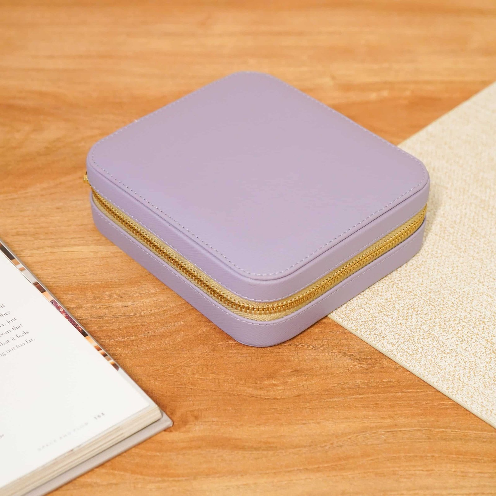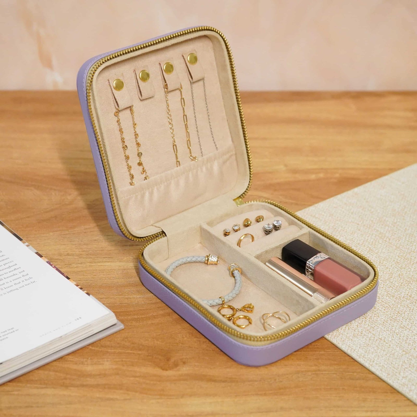 Perfect for the traveler who loves a bit of elegance on the go! This petite jewellery box is as stylish as it is practical. The light, faux leather case in a soft lavender hue is compact yet spacious, making it the ideal companion for keeping your favorite pieces safe wherever you wander. With a secure zipper, it’s designed to prevent tangles and protect your accessories, so they’re ready to shine whenever you are.