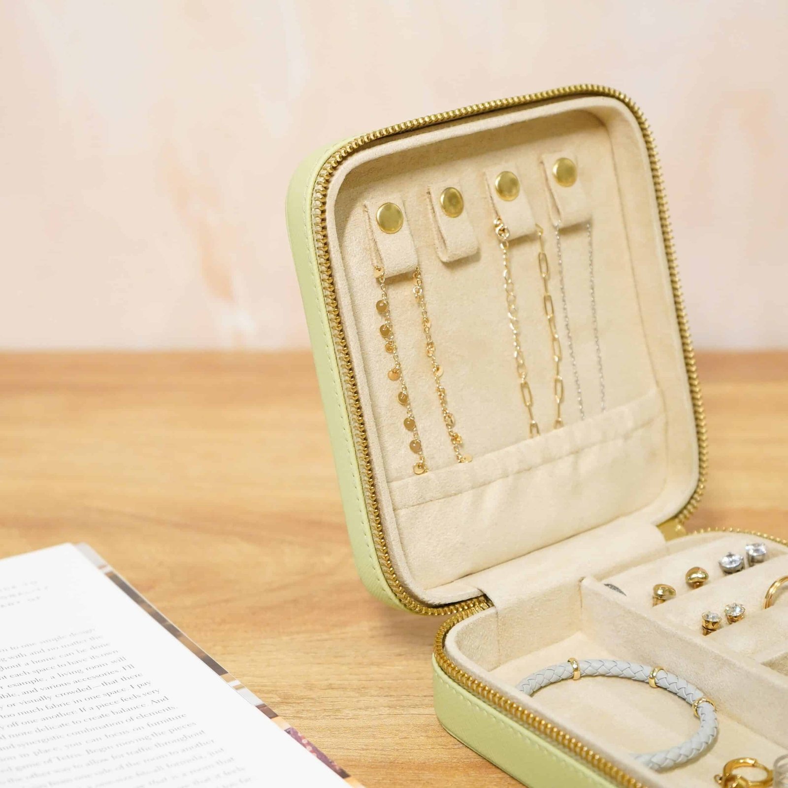 Perfect for the traveler who loves a bit of elegance on the go! This petite jewellery box is as stylish as it is practical. The light, faux leather case in a soft pastel green hue is compact yet spacious, making it the ideal companion for keeping your favorite pieces safe wherever you wander. With a secure zipper, it’s designed to prevent tangles and protect your accessories, so they’re ready to shine whenever you are.