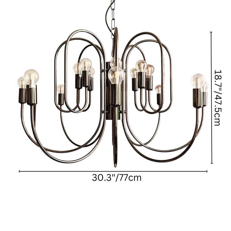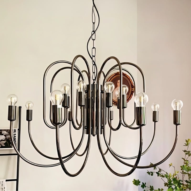 The Fethr Chandelier is an iron light fixture with a bold, sculptural design featuring fluid, curved arms and exposed bulb sockets for an industrial edge. Its sleek black finish enhances modern, minimalist, and industrial interiors, making it a striking centerpiece. The open-frame structure allows even light distribution, perfect for dining rooms, living areas, and entryways. This contemporary chandelier merges elegance with functionality, creating a statement in any space.