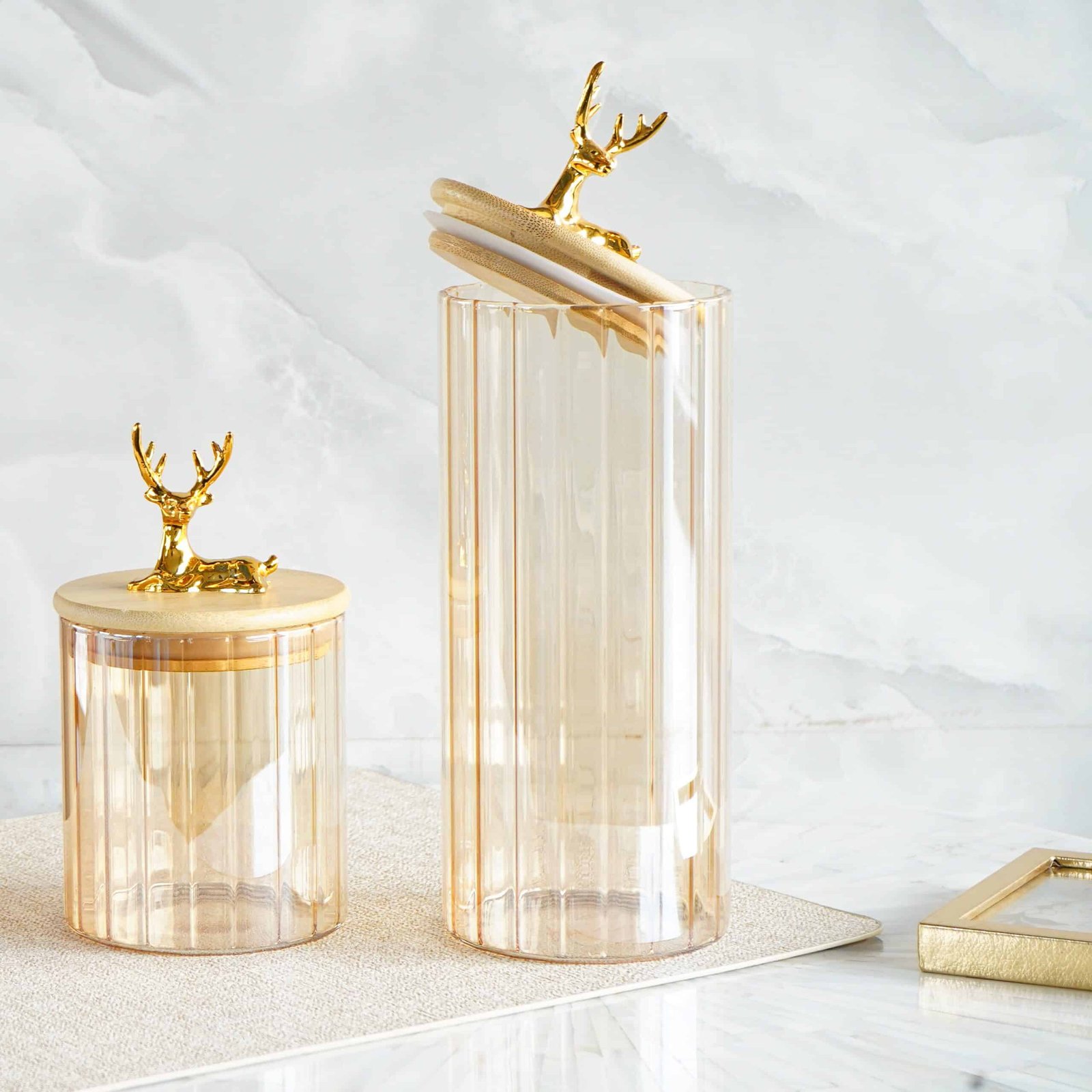 Elevate your storage solutions with these golden tinted airtight jars, designed to combine functionality with refined elegance. Each jar is crafted from premium materials, featuring a beautifully polished surface that complements any kitchen or pantry décor. The reindeer motif on the handle ads to the appeal. Ideal for preserving the freshness of your dry goods, these airtight jars are perfect for storing everything from spices and coffee to cookies and snacks. Keep your essentials sealed with style.