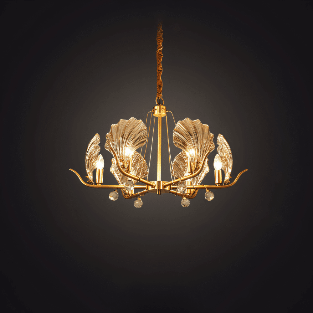 Fovia Chandelier is a sculptural statement piece that pairs luxurious copper craftsmanship with delicate, fan-shaped glass petals. Gracefully curved arms cradle each shade, casting a soft, ambient glow through translucent leaves. Blending organic elegance with contemporary design, this chandelier brings elevated sophistication to dining rooms, foyers, and bedrooms alike. A true fusion of art and illumination, it transforms any space with refined charm.