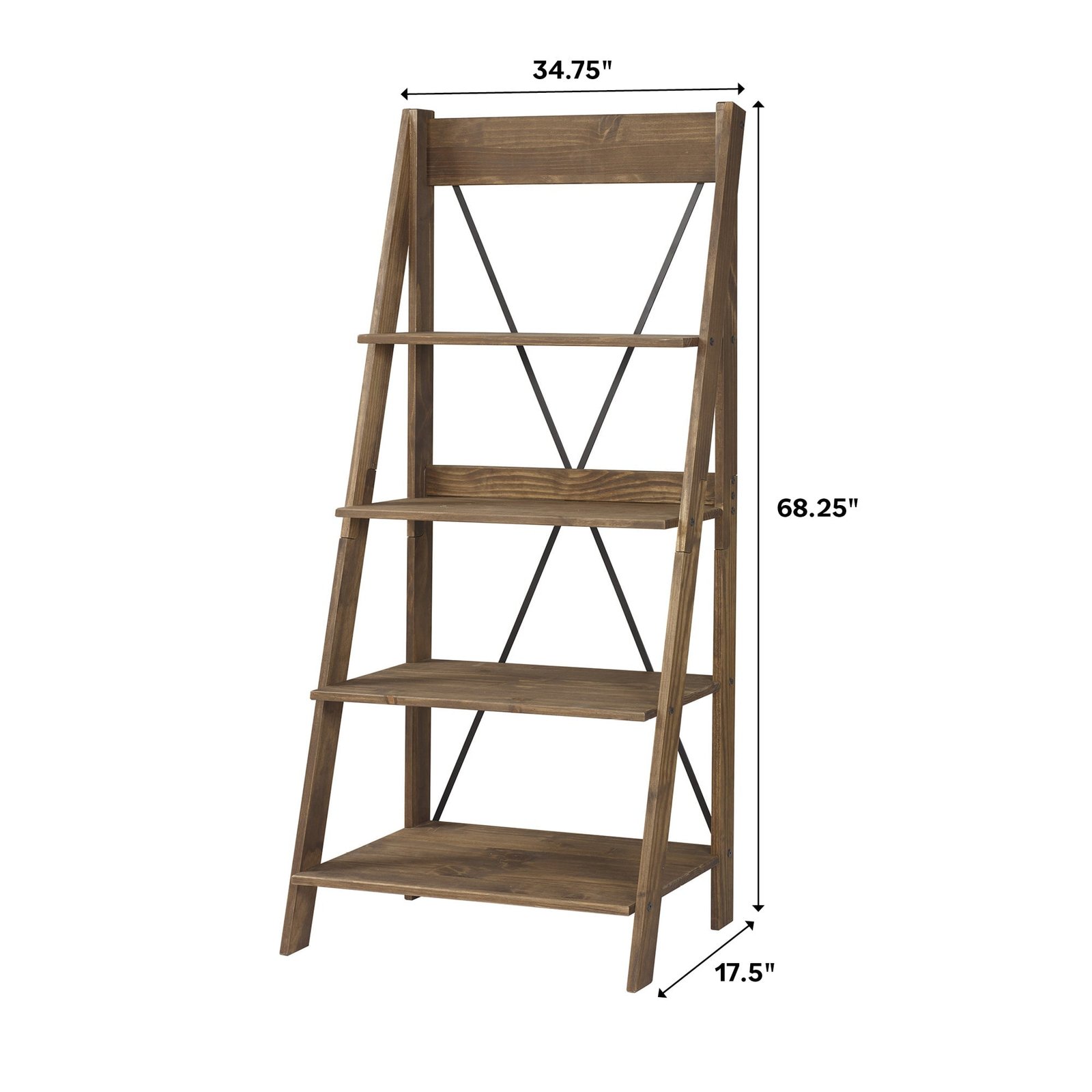 Whether you decide to cascade your growing collection of house plants or show off your personal art gallery on this solid wood ladder unit, its four fixed shelves will support whatever you choose. This straightforward bookshelf blends well with a variety or room styles. Made from pine wood, this durable ladder shelf features a metal X on the back of the unit for an extra design splash. The shelf depths from top to bottom are: 8.75”, 10.75”, 14.25”, 16.75”.