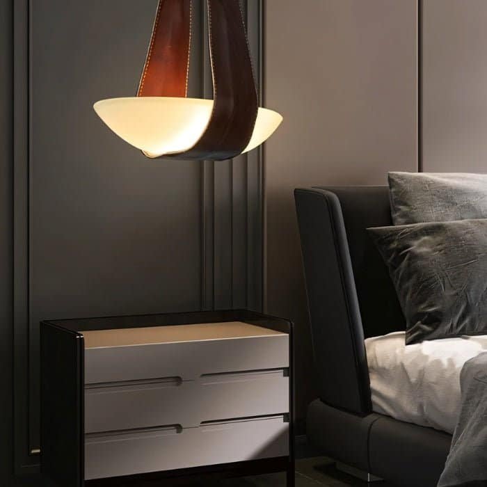 Introducing the Fune Pendant Light, perfect for bedside tables or any space needing a modern Nordic touch with its boat-shaped design. Crafted from quality leather and frosted glass, it adds warmth and sophistication, offering energy efficiency and durability to elevate your space’s ambiance effortlessly.
