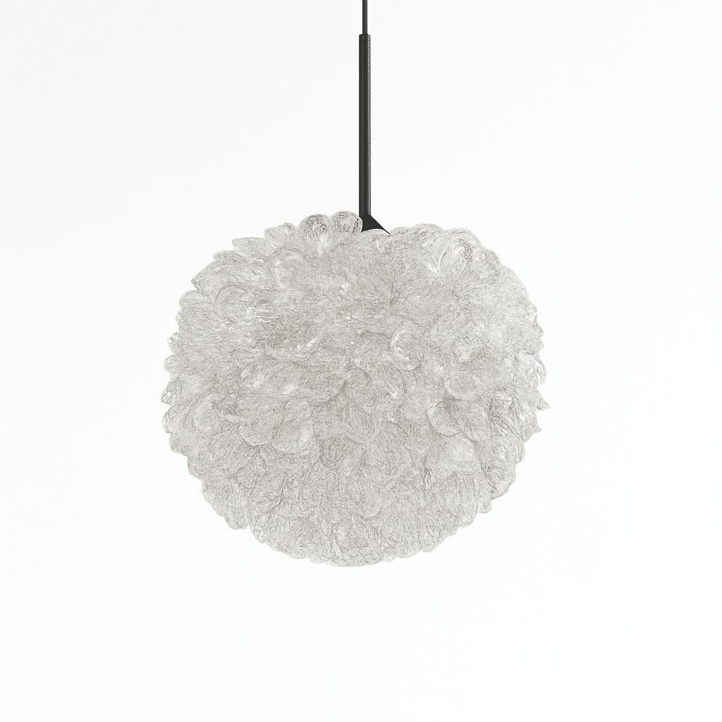 The Fyrin Pendant Light is a spherical aluminum and Crystal light fixture featuring a textured, crystalline surface that emits a warm, ambient glow. Its artistic design, resembling blooming clusters, complements modern and contemporary interiors. Ideal for living rooms, dining areas, or entryways, this pendant enhances spaces with its soft illumination. Its suspended, minimalist design suits both high ceilings and cozy, intimate settings.