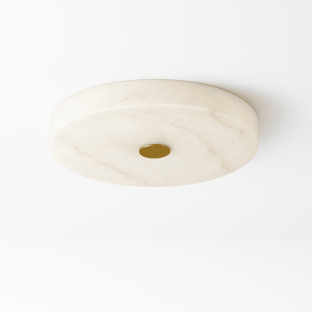 The Gaba Alabaster Ceiling Light features a circular alabaster marble shade that diffuses soft, inviting light. Its naturally veined surface creates a warm glow, while a central copper accent adds a subtle metallic touch. This minimalist design highlights the beauty of natural stone, making it a perfect blend of elegance and simplicity for a hallway, bathroom, or bedroom.