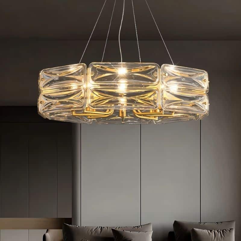 The Nyvora Round Chandelier is a modern light fixture featuring a circular copper frame with precision-cut glass elements that create a layered, reflective design. Its adjustable 150cm hanging line allows flexible installation in dining rooms, living areas, and upscale commercial spaces. The chandelier houses E14 bulbs, casting a warm, diffused glow through its geometric glass structure. This statement piece is available in four sizes and blends contemporary aesthetics with durable craftsmanship.