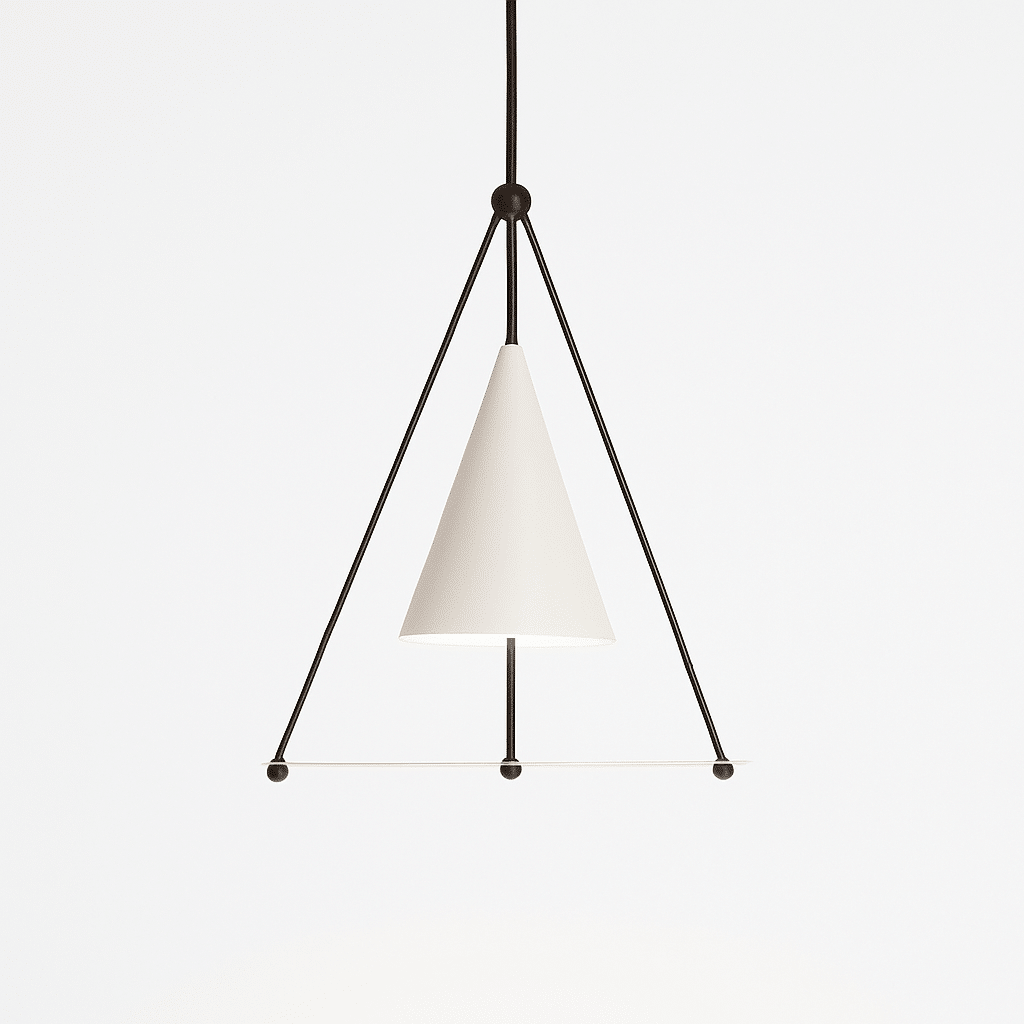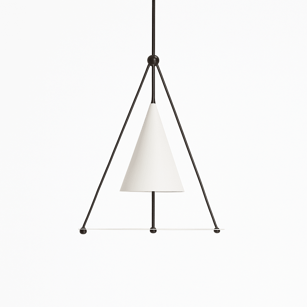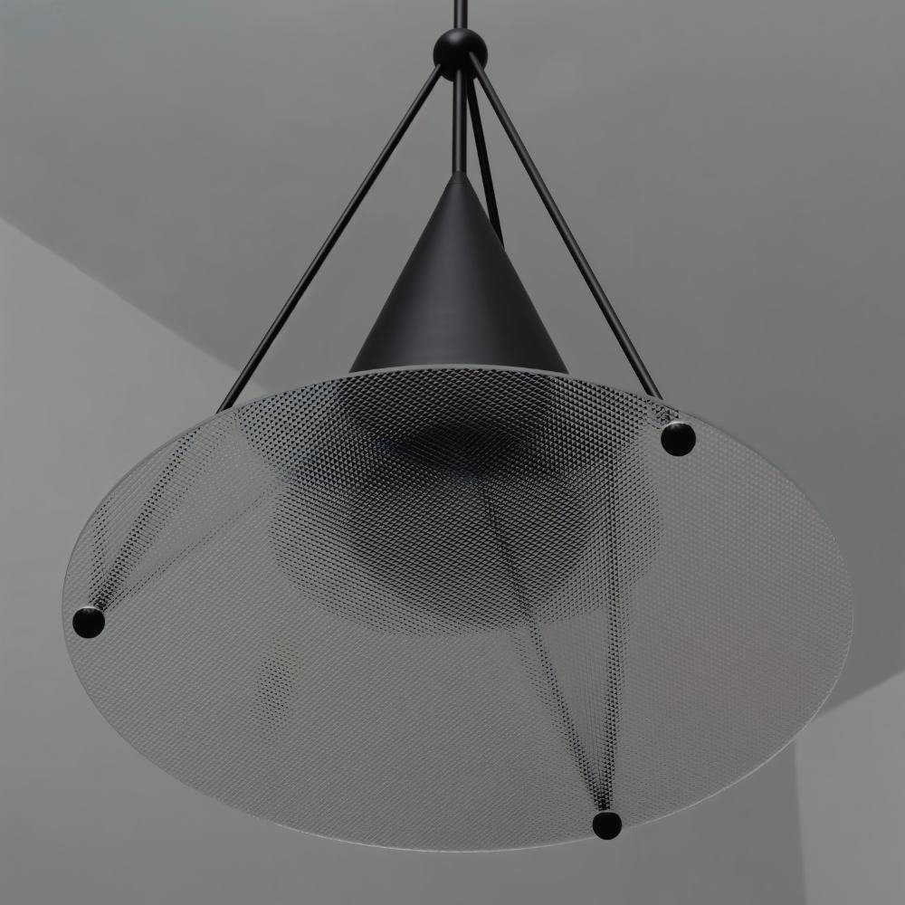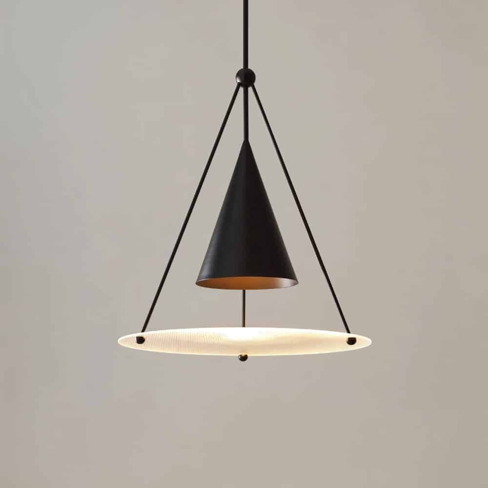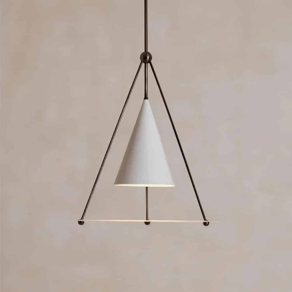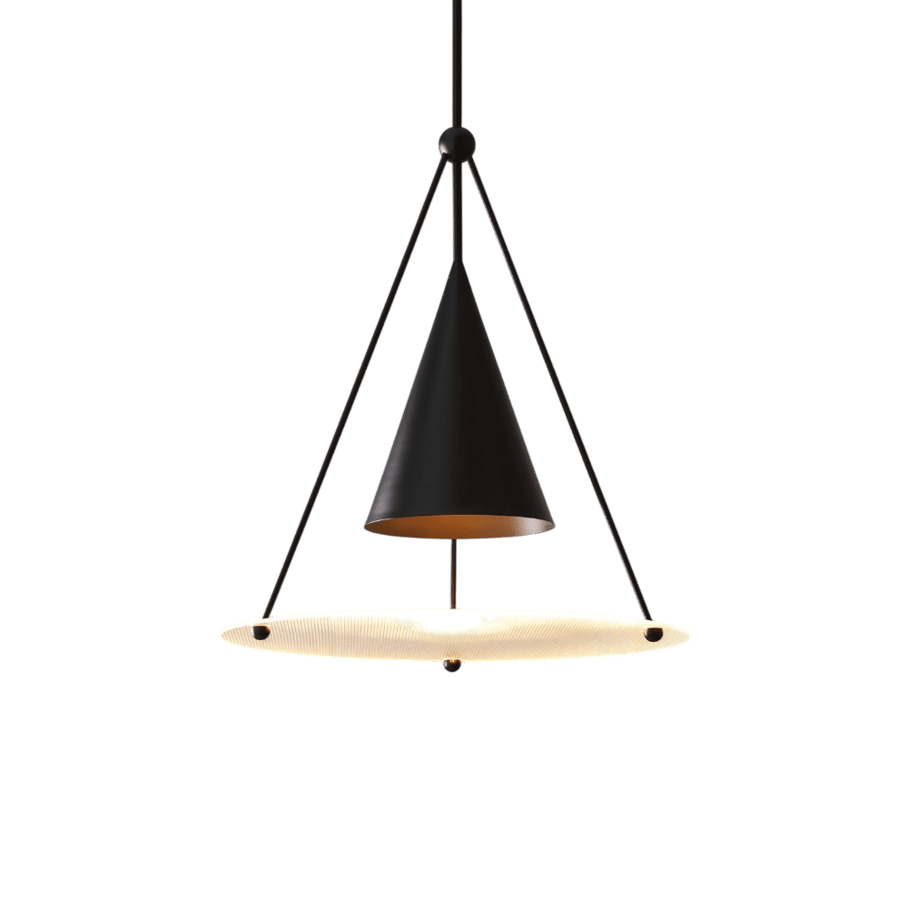 Glame pendant light features a bold geometric light fixture combining glass and metal elements. Its conical top directs light downward, while the suspended frosted glass disc diffuses a soft, ambient glow. The triangular support structure enhances its architectural appeal, making it ideal for dining areas, modern living spaces, and statement entryways. Designed for contemporary interiors, this pendant light balances elegance and functionality with striking contrast and clean design.
