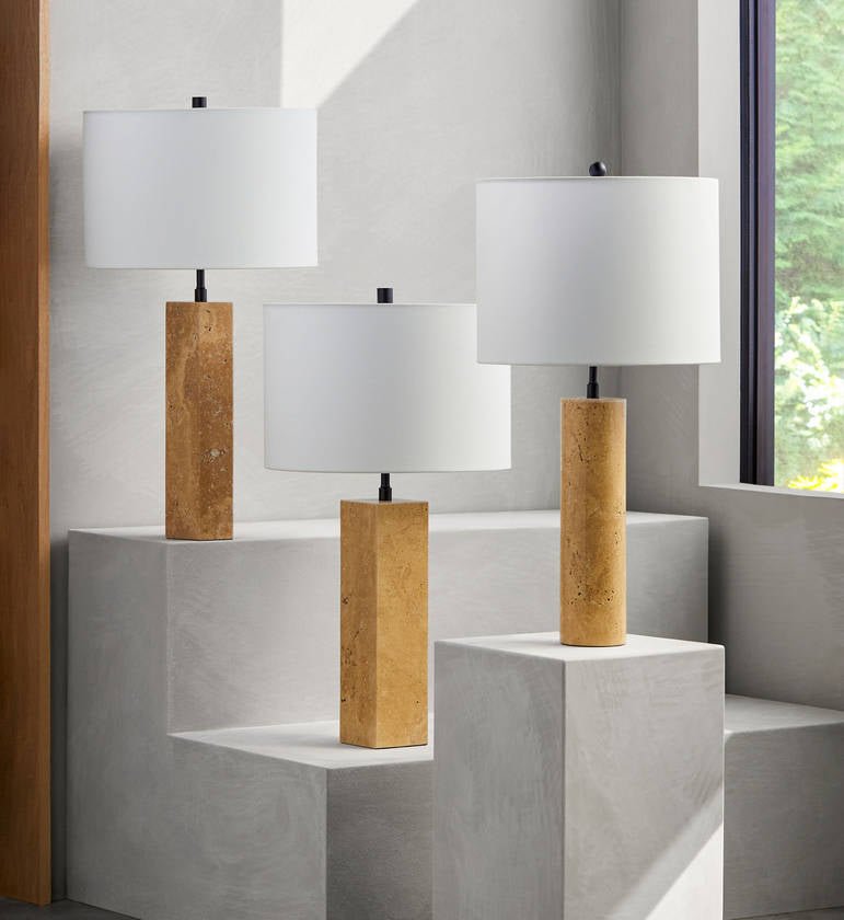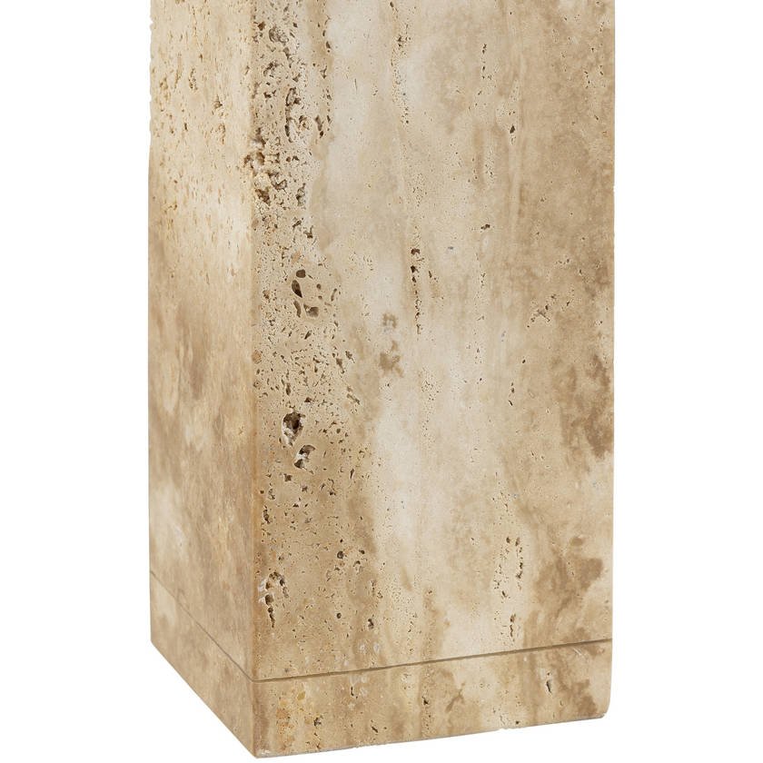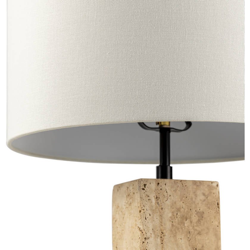 - Material: Body: Travertine, Iron; Shade (Outside): Linen; Shade (Inside): Polyester; Finial: Iron