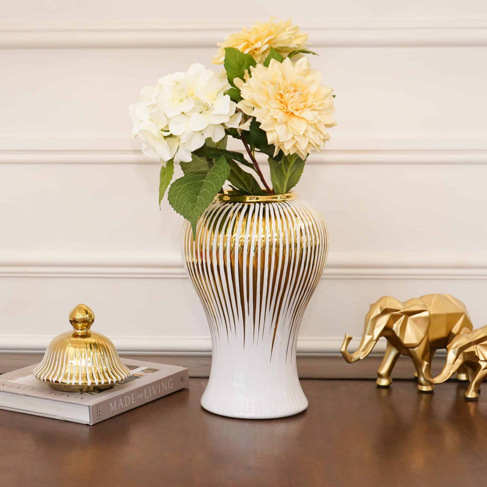Be the first to review “Gold and Ivory Fluted Ceramic Urn with Lid, Big”
