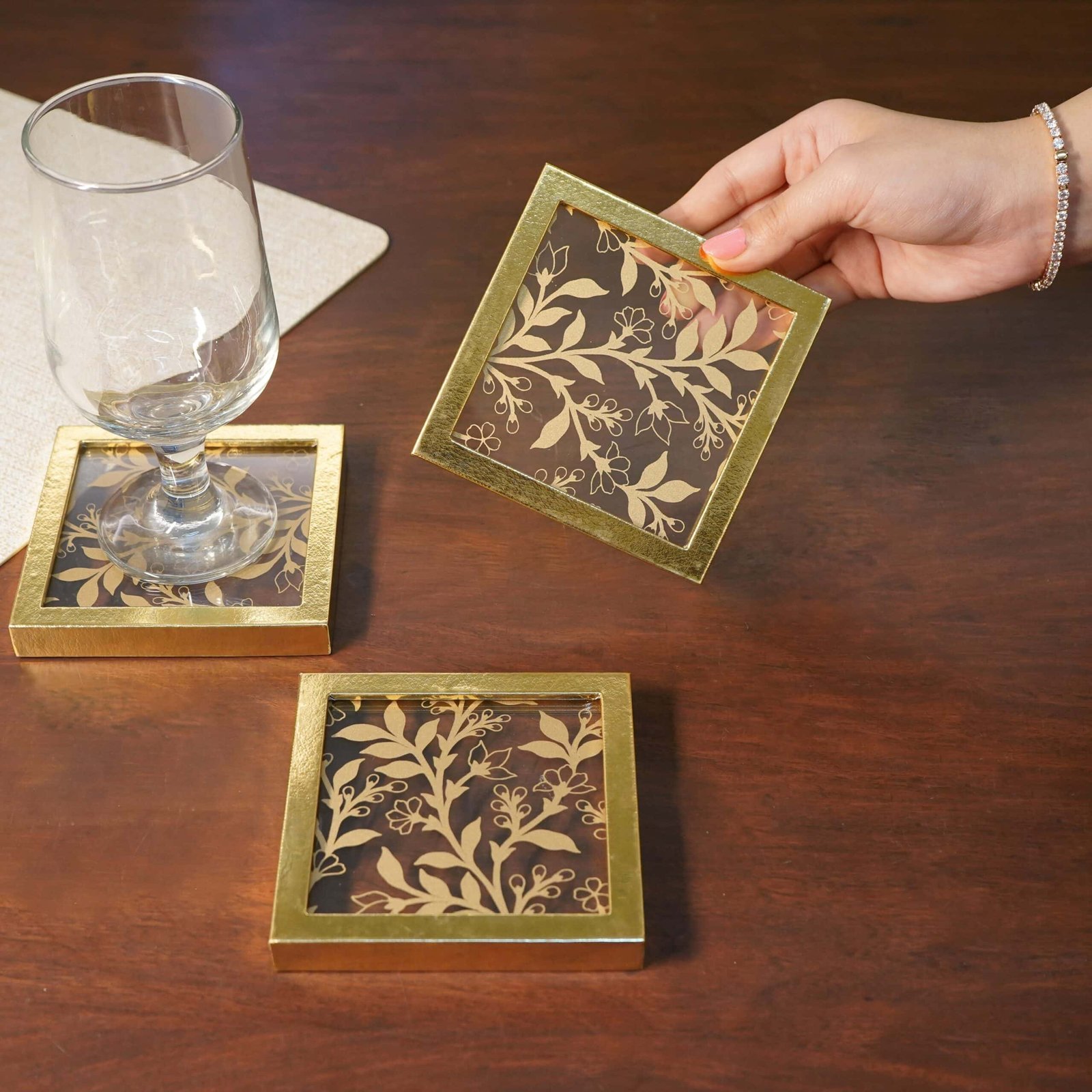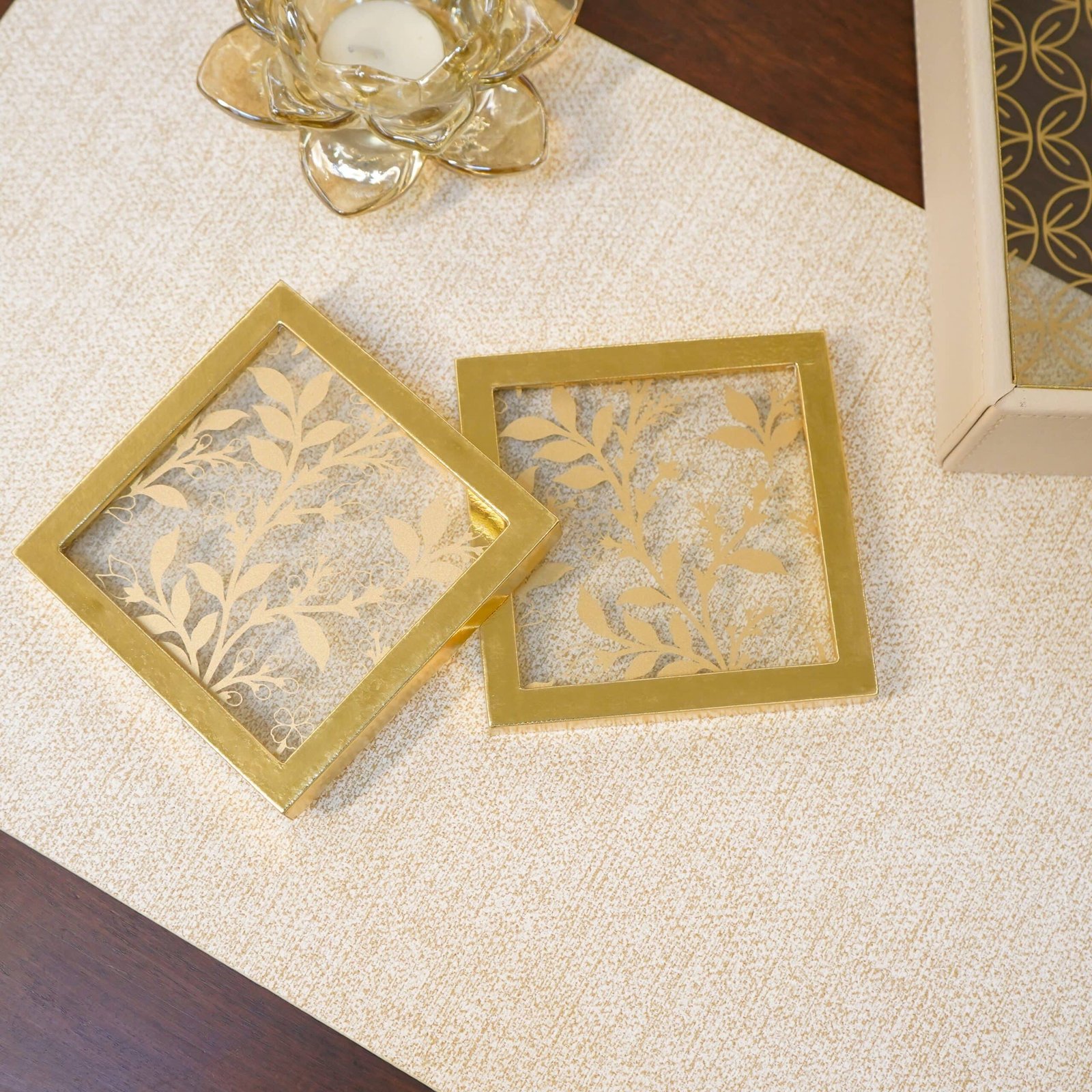 This elegant piece features a polished glass surface with an embossed glass finish, perfectly framed by a sleek faux leather golden border. The mirror’s gleam beautifully complements the soft sheen of the border, creating a stylish contrast that’s both modern and classic. Designed to protect your surfaces while elevating your decor, this coaster makes every beverage feel like a special occasion. Perfect for entertaining or everyday use, it’s the ultimate blend of form and function.