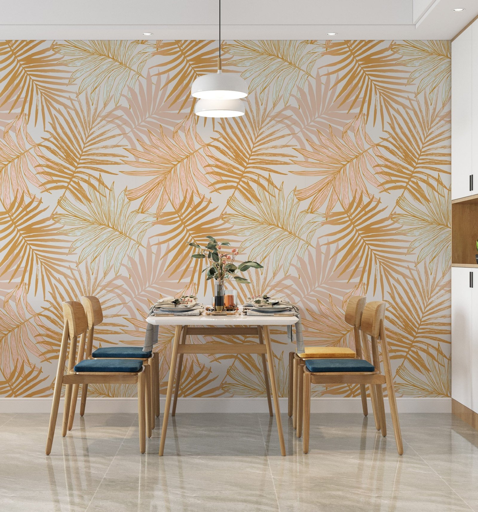 Transform your space into a tropical paradise with our Golden Tropical Leaves Wallpaper Peel and Stick! Its vibrant golden hues and easy installation make it the perfect addition to any room. Bring a touch of nature and elegance to your space instantly. Upgrade your walls today!