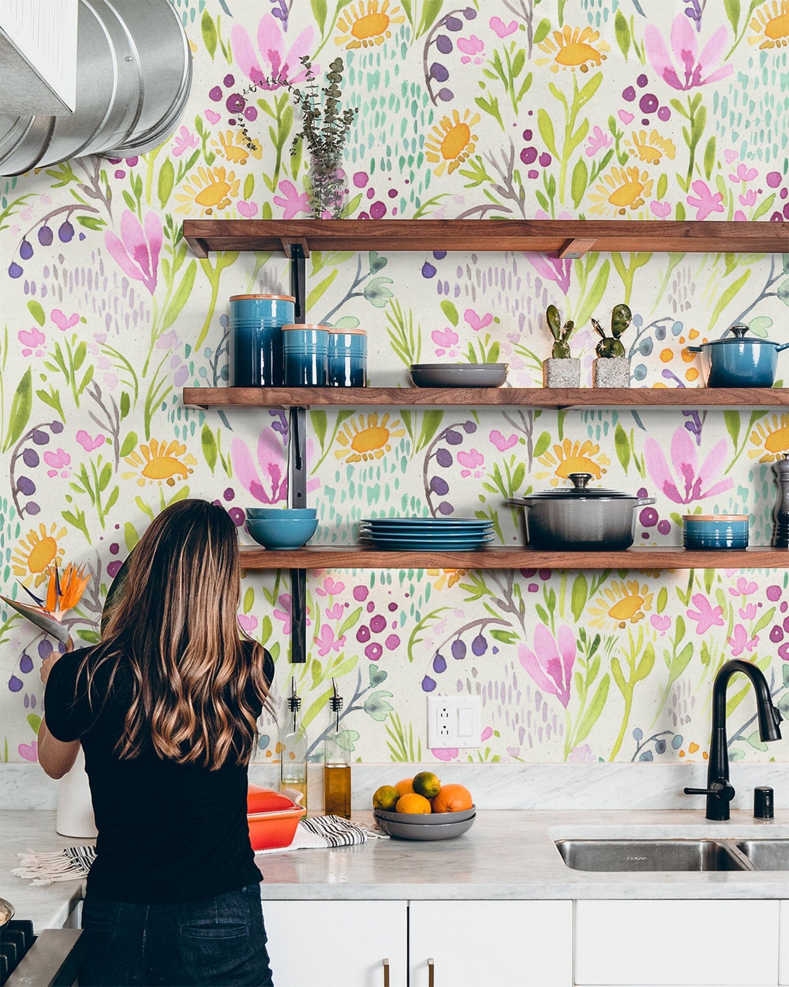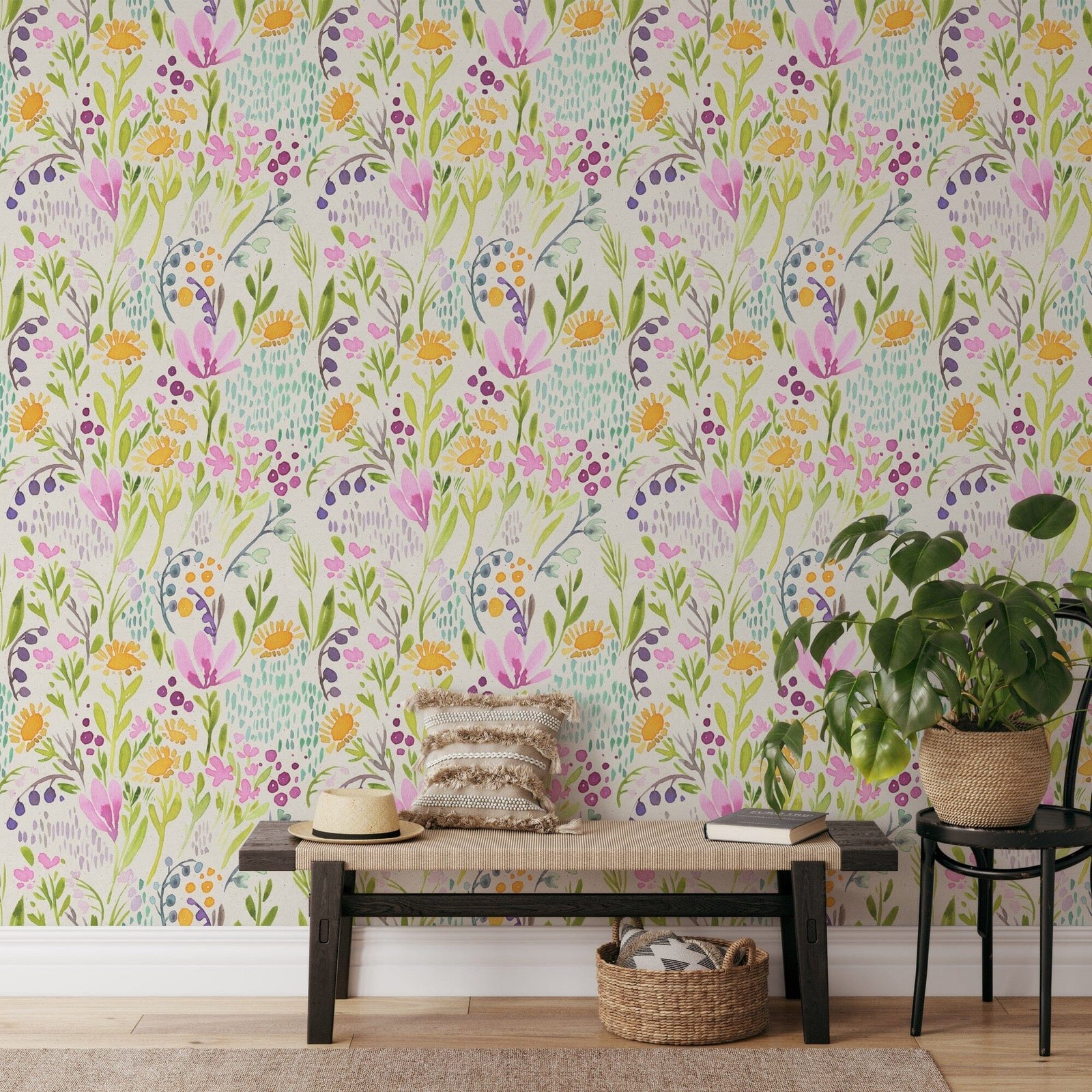 Create a vibrant atmosphere in your home with this colorful, hand painted wallpaper! Perfect for a girl’s room decor, this wallpaper will bring a cheerful feel to any space. Bring joy into your home today!