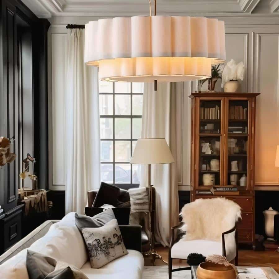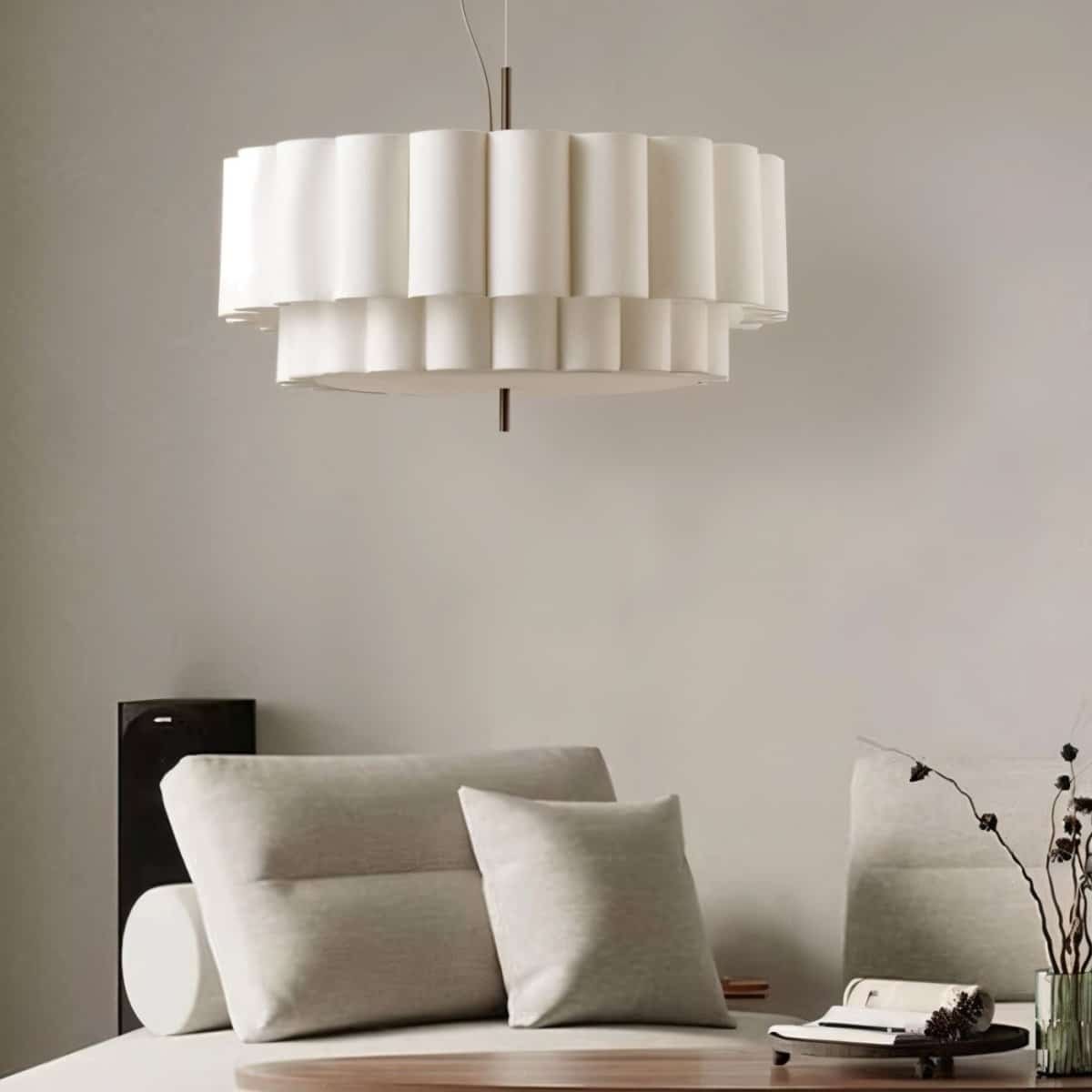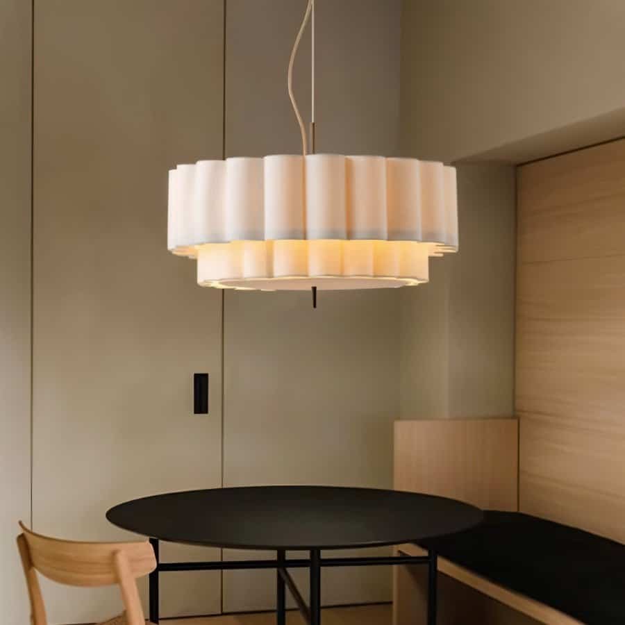The Hetis Pendant Light is a sophisticated light fixture crafted from durable iron and elegant cloth, designed to elevate modern interiors. Its layered fabric drum shade creates a soft, warm glow, adding depth and texture to any room. The minimalist yet artistic structure makes it ideal for dining rooms, living areas, or bedrooms.