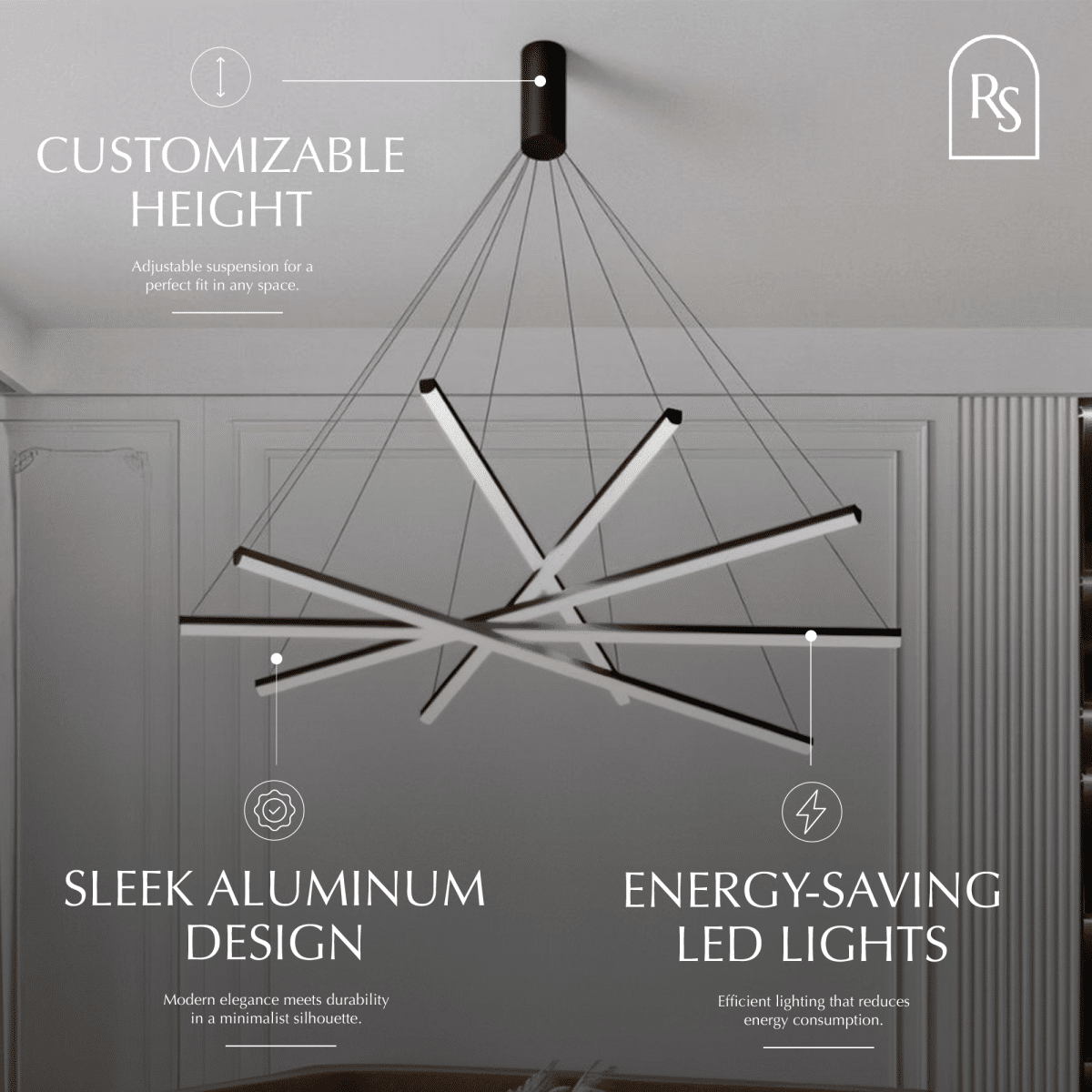 Enhance the luminance of your living space with the exquisite and refined Ilona Chandelier. This modern yet opulent masterpiece radiates a commanding brilliance through its meticulously arranged linear lights. Crafted from premium aluminum, boasting a bold black or white finish, and complemented by silicon diffusers, it casts a crisp and sophisticated radiance. Delicately suspended by wires, this chandelier offers customizable height, ensuring a flawless fit for your discerning taste and elegant space.