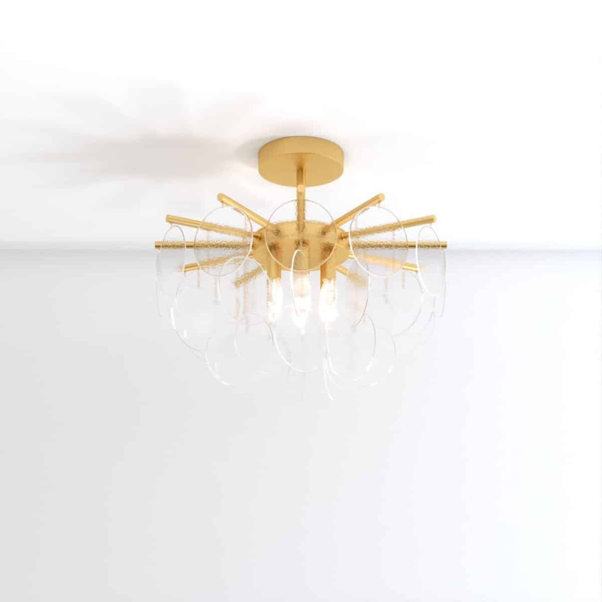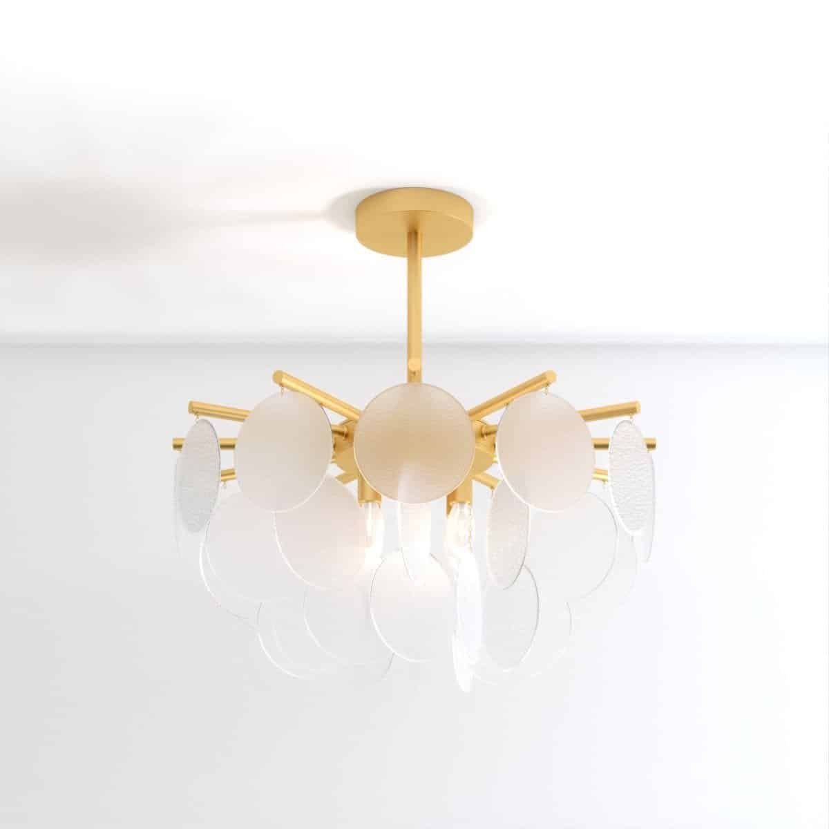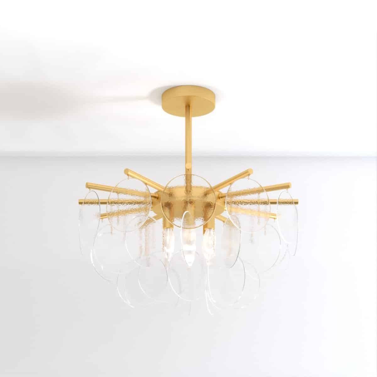 Prepare to be immersed in a world of luminous grandeur as the Isla Chandelier becomes the centerpiece of your room. Its timeless allure is embodied in a classic gold-finished frame, embellished with exquisite glass discs that feature a bubbled texture. These discs, gracefully scatter and refract light, resulting in a celestial luminescence that envelops your surroundings. The chandelier adds an air of opulence and splendor to any space it graces, leaving onlookers captivated by its beauty.